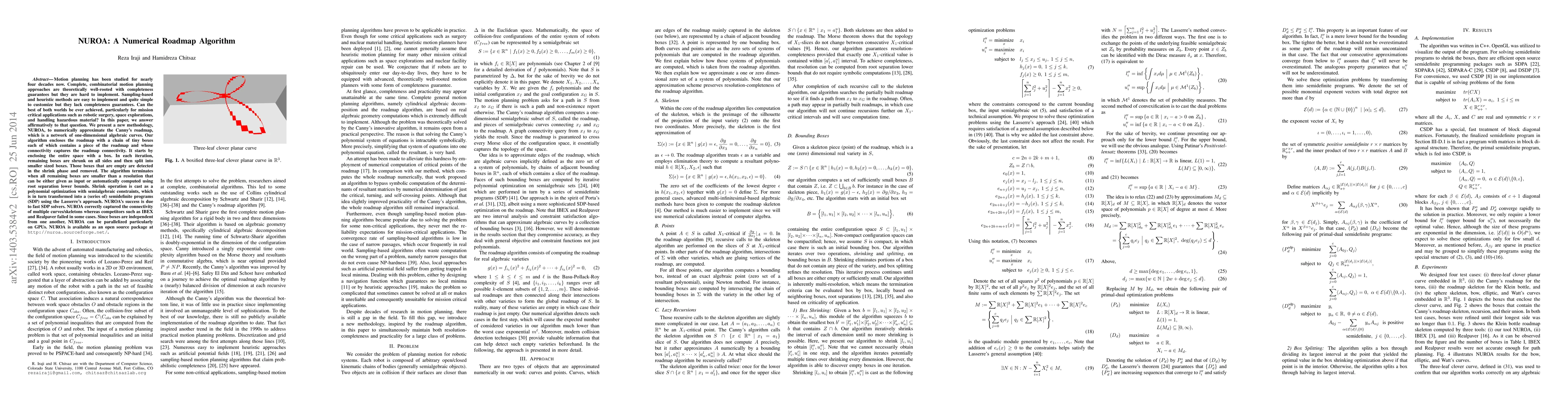 Motion planning has been studied for nearly four decades now. Complete, combinatorial motion planning approaches are theoretically well-rooted with completeness guarantees but they are hard to implement. Sampling-based and heuristic methods are easy to implement and quite simple to customize but they lack completeness guarantees. Can the best of both worlds be ever achieved, particularly for mission critical applications such as robotic surgery, space explorations, and handling hazardous material? In this paper, we answer affirmatively to that question. We present a new methodology, NUROA, to numerically approximate the Canny's roadmap, which is a network of one-dimensional algebraic curves. Our algorithm encloses the roadmap with a chain of tiny boxes each of which contains a piece of the roadmap and whose connectivity captures the roadmap connectivity. It starts by enclosing the entire space with a box. In each iteration, remaining boxes are shrunk on all sides and then split into smaller sized boxes. Those boxes that are empty are detected in the shrink phase and removed. The algorithm terminates when all remaining boxes are smaller than a resolution that can be either given as input or automatically computed using root separation lower bounds. Shrink operation is cast as a polynomial optimization with semialgebraic constraints, which is in turn transformed into a (series of) semidefinite programs (SDP) using the Lasserre's approach. NUROA's success is due to fast SDP solvers. NUROA correctly captured the connectivity of multiple curves/skeletons whereas competitors such as IBEX and Realpaver failed in some cases. Since boxes are independent from one another, NUROA can be parallelized particularly on GPUs. NUROA is available as an open source package at http://nuroa.sourceforge.net/.