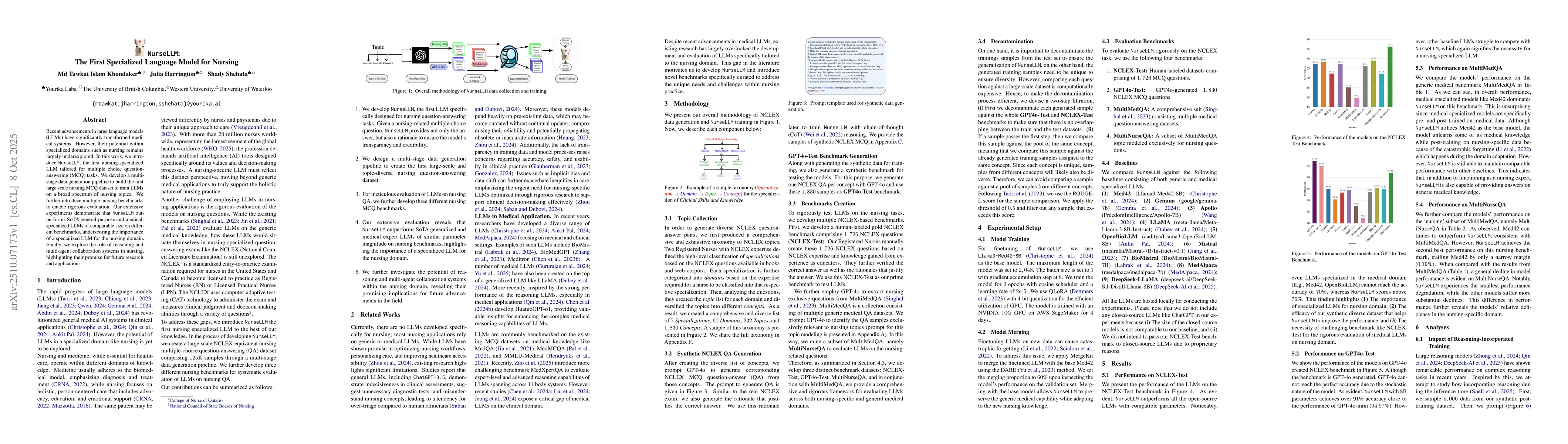 Recent advancements in large language models (LLMs) have significantly transformed medical systems. However, their potential within specialized domains such as nursing remains largely underexplored. In this work, we introduce NurseLLM, the first nursing-specialized LLM tailored for multiple choice question-answering (MCQ) tasks. We develop a multi-stage data generation pipeline to build the first large scale nursing MCQ dataset to train LLMs on a broad spectrum of nursing topics. We further introduce multiple nursing benchmarks to enable rigorous evaluation. Our extensive experiments demonstrate that NurseLLM outperforms SoTA general-purpose and medical-specialized LLMs of comparable size on different benchmarks, underscoring the importance of a specialized LLM for the nursing domain. Finally, we explore the role of reasoning and multi-agent collaboration systems in nursing, highlighting their promise for future research and applications.