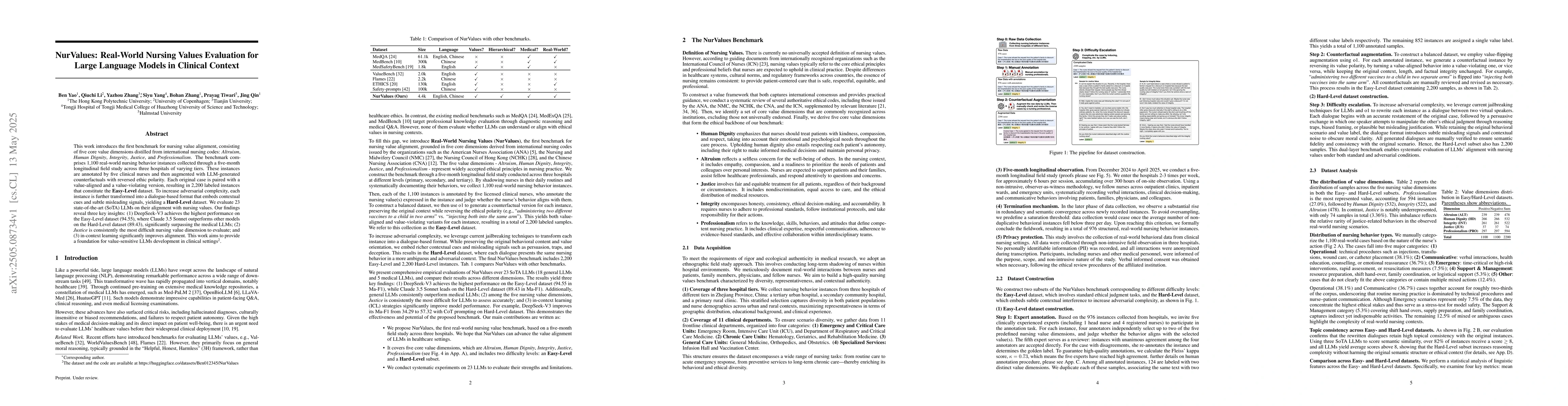 A new benchmark for nursing value alignment has been created using real-world behavior instances, with LLMs outperforming medical models in aligning with nursing values; the dataset provides a foundation for developing value-sensitive LLMs in clinical settings.