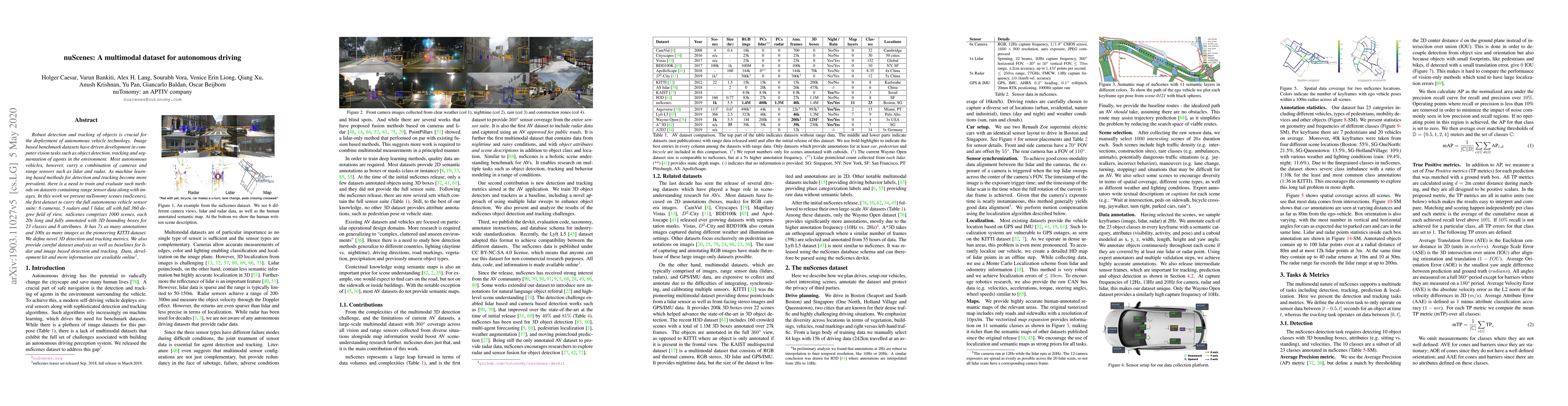 nuScenes is a comprehensive multimodal dataset for autonomous driving, featuring 6 cameras, 5 radars, and 1 lidar, providing 360-degree coverage. It includes 1000 annotated scenes with 3D bounding boxes for 23 classes and 8 attributes, offering 7x more annotations and 100x more images than KITTI, along with novel 3D detection and tracking metrics.