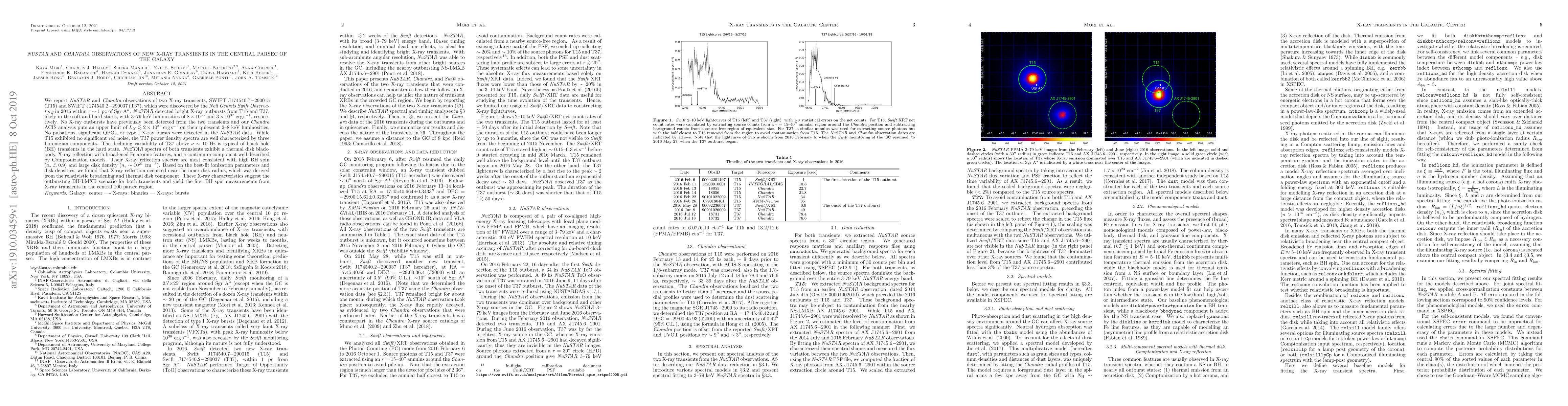 We report NuSTAR and Chandra observations of two X-ray transients, SWIFT J174540.7$-$290015 (T15) and SWIFT J174540.2$-$290037 (T37), which were discovered by the Neil Gehrels Swift Observatory in 2016 within $r\sim1$ pc of Sgr A*. NuSTAR detected bright X-ray outbursts from T15 and T37, likely in the soft and hard states, with 3-79~keV luminosities of $8\times10^{36}$ and $3\times10^{37}$ erg/s, respectively. No X-ray outbursts have previously been detected from the two transients and our Chandra ACIS analysis puts an upper limit of $L_X \lesssim 2 \times10^{31}$ erg/s on their quiescent 2-8 keV luminosities. No pulsations, significant QPOs, or type I X-ray bursts were detected in the NuSTAR data. While T15 exhibited no significant red noise, the T37 power density spectra are well characterized by three Lorentzian components. The declining variability of T37 above $\nu \sim 10$ Hz is typical of black hole (BH) transients in the hard state. NuSTAR spectra of both transients exhibit a thermal disk blackbody, X-ray reflection with broadened Fe atomic features, and a continuum component well described by Comptonization models. Their X-ray reflection spectra are most consistent with high BH spin ($a_{*} \gtrsim 0.9$) and large disk density ($n_e\sim10^{21}$ cm$^{-3}$). Based on the best-fit ionization parameters and disk densities, we found that X-ray reflection occurred near the inner disk radius, which was derived from the relativistic broadening and thermal disk component. These X-ray characteristics suggest the outbursting BH-LMXB scenario for both transients and yield the first BH spin measurements from X-ray transients in the central 100 pc region.