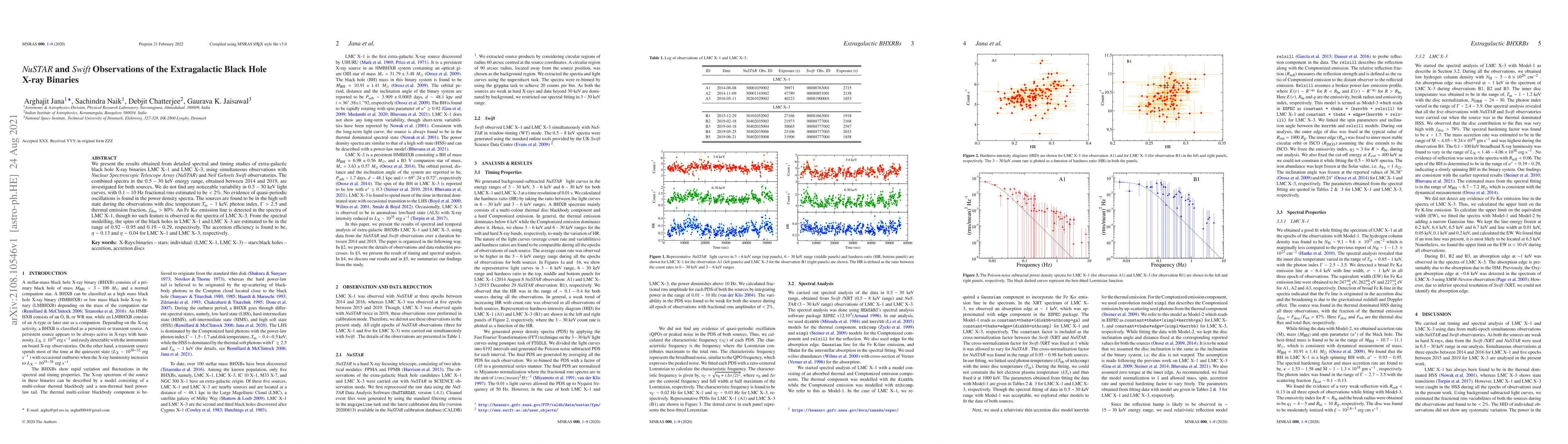 We present the results obtained from detailed spectral and timing studies of extra-galactic black hole X-ray binaries LMC~X--1 and LMC~X--3, using simultaneous observations with {\it Nuclear Spectroscopic Telescope Array (NuSTAR)} and {\it Neil Gehrels Swift} observatories. The combined spectra in the $0.5-30$~keV energy range, obtained between 2014 and 2019, are investigated for both sources. We do not find any noticeable variability in $0.5-30$~keV light curves, with $0.1-10$~Hz fractional rms estimated to be $<2$\%. No evidence of quasi-periodic oscillations is found in the power density spectra. The sources are found to be in the high soft state during the observations with disc temperature $T_{\rm in}\sim 1$~keV, photon index, $\Gamma > 2.5$ and thermal emission fraction, $f_{\rm disc}>80$\%. An Fe K$\alpha$ emission line is detected in the spectra of LMC~X--1, though no such feature is observed in the spectra of LMC~X--3. From the spectral modelling, the spins of the black holes in LMC~X--1 and LMC~X--3 are estimated to be in the range of $0.92-0.95$ and $0.19-0.29$, respectively. The accretion efficiency is found to be, $\eta \sim 0.13$ and $\eta \sim 0.04$ for LMC~X--1 and LMC~X--3, respectively.