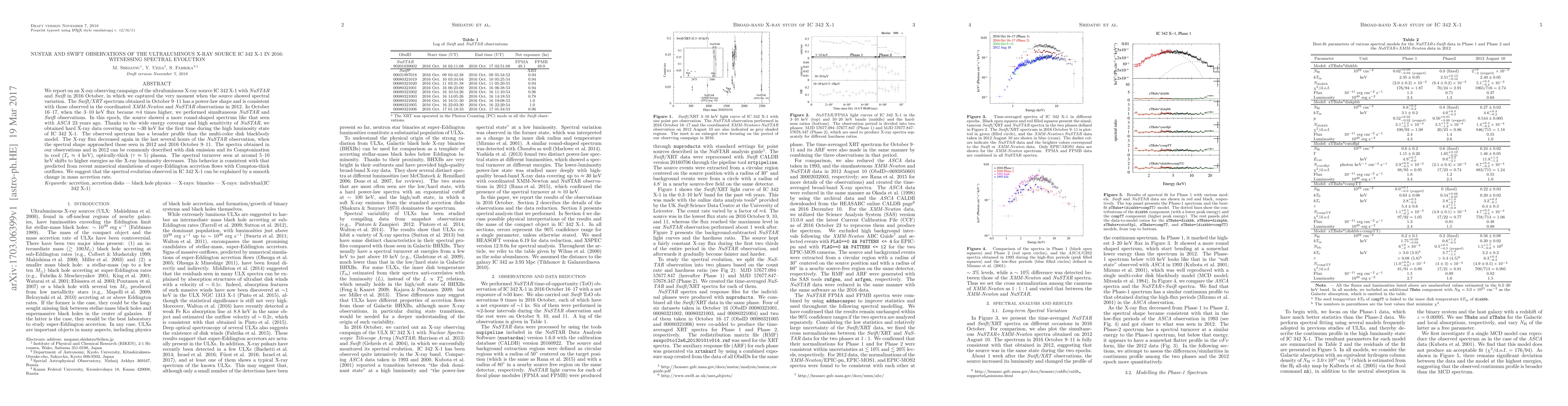 This study reports on NuSTAR and Swift observations of the ultraluminous X-ray source IC 342 X-1 in 2016, capturing spectral evolution as the source's luminosity varied. The source exhibited a more rounded spectrum during a high-flux state, suggesting a change in mass accretion rate, consistent with super-Eddington accretion models.