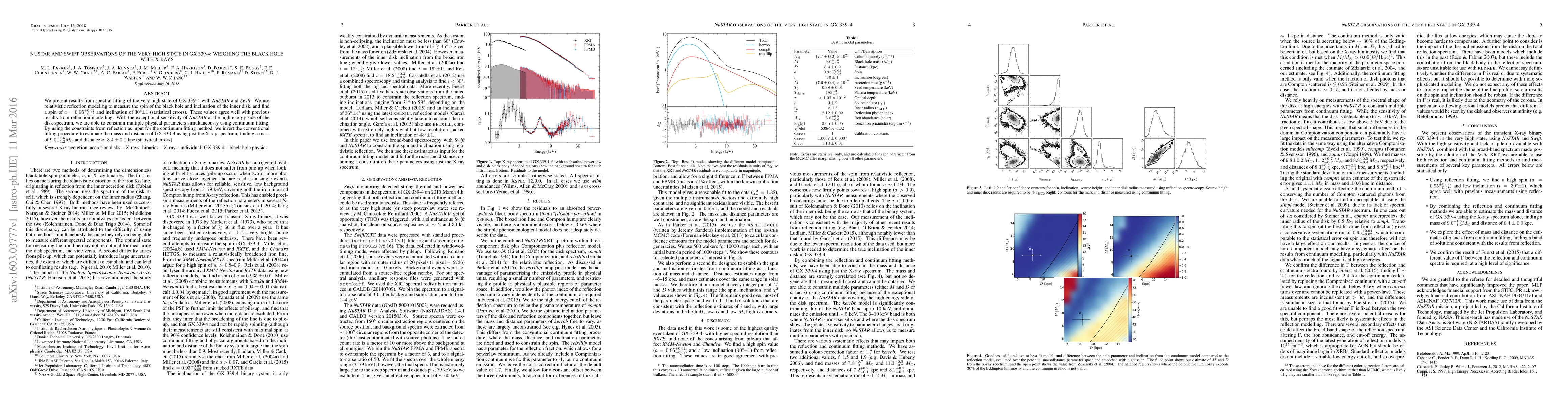 We present results from spectral fitting of the very high state of GX~339-4 with NuSTAR and Swift. We use relativistic reflection modelling to measure the spin of the black hole and inclination of the inner disk, and find a spin of $a=0.95^{+0.02}_{-0.08}$ and inclination of $30${\deg}$\pm1$ (statistical errors). These values agree well with previous results from reflection modelling. With the exceptional sensitivity of NuSTAR at the high-energy side of the disk spectrum, we are able to constrain multiple physical parameters simultaneously using continuum fitting. By using the constraints from reflection as input for the continuum fitting method, we invert the conventional fitting procedure to estimate the mass and distance of GX~339-4 using just the X-ray spectrum, finding a mass of $9.0^{+1.6}_{-1.2}M_\odot$ and distance of $8.4\pm0.9$ kpc (statistical errors).