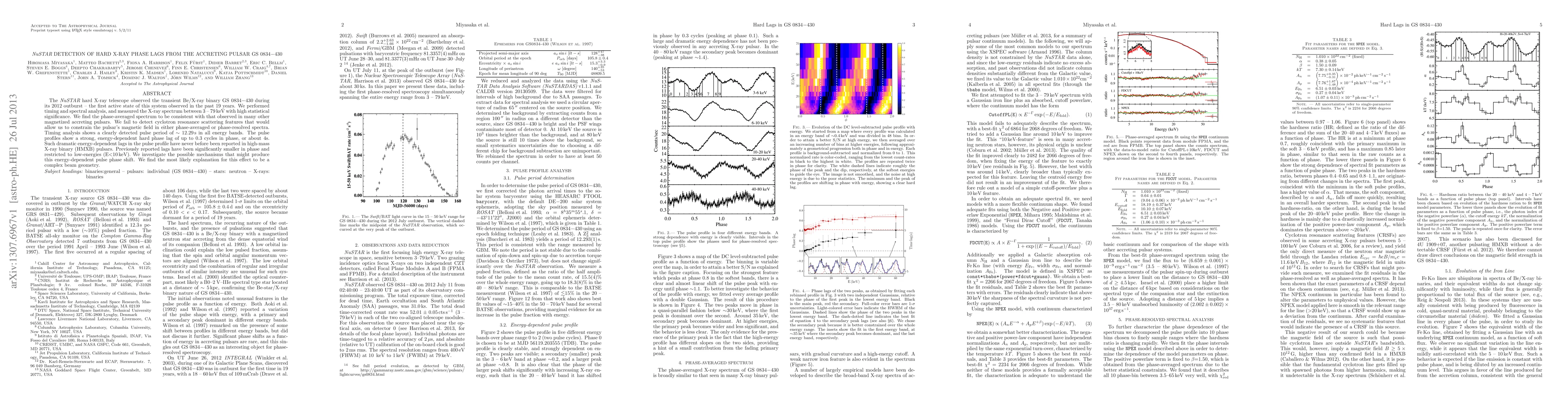 The NuSTAR hard X-ray telescope observed the transient Be/X-ray binary GS 0834-430 during its 2012 outburst - the first active state of this system observed in the past 19 years. We performed timing and spectral analysis, and measured the X-ray spectrum between 3-79keV with high statistical significance. We find the phase-averaged spectrum to be consistent with that observed in many other magnetized accreting pulsars. We fail to detect cyclotron resonance scattering features that would allow us to constrain the pulsar's magnetic field in either phase-averaged or phase-resolved spectra. Timing analysis shows a clearly detected pulse period of ~12.29s in all energy bands. The pulse profiles show a strong, energy-dependent hard phase lag of up to 0.3 cycles in phase, or about 4s. Such dramatic energy-dependent lags in the pulse profile have never before been reported in high-mass X-ray binary (HMXB) pulsars. Previously reported lags have been significantly smaller in phase and restricted to low-energies (E<10keV). We investigate the possible mechanisms that might produce this energy-dependent pulse phase shift. We find the most likely explanation for this effect to be a complex beam geometry.