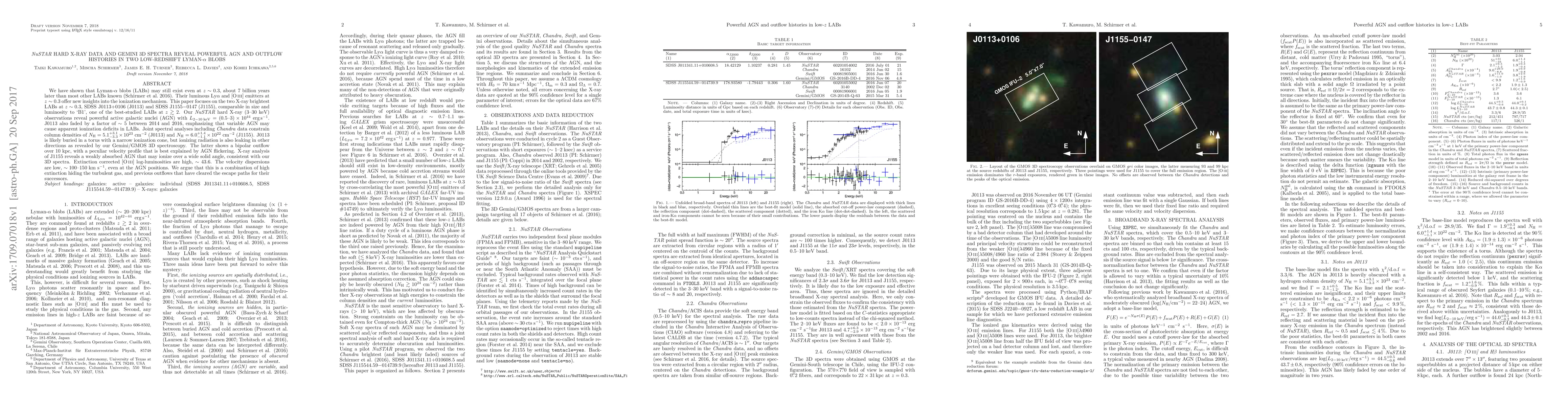 We have shown that Lyman-$\alpha$ blobs (LABs) may still exist even at $z\sim0.3$, about 7 billion years later than most other LABs known (Schirmer et al. 2016). Their luminous Ly$\alpha$ and [OIII] emitters at $z\sim0.3$ offer new insights into the ionization mechanism. This paper focuses on the two X-ray brightest LABs at $z\sim0.3$, SDSS J0113$+$0106 (J0113) and SDSS J1155$-$0147 (J1155), comparable in size and luminosity to `B1', one of the best-studied LABs at $z \gtrsim$ 2. Our NuSTAR hard X-ray (3--30 keV) observations reveal powerful active galactic nuclei (AGN) with $L_{2-10{\;\rm keV}}=(0.5$--$3)\times10^{44}$ erg cm$^{-2}$ s$^{-1}$. J0113 also faded by a factor of $\sim 5$ between 2014 and 2016, emphasizing that variable AGN may cause apparent ionization deficits in LABs. Joint spectral analyses including Chandra data constrain column densities of $N_{\rm H}=5.1^{+3.1}_{-3.3}\times10^{23}$ cm$^{-2}$ (J0113) and $N_{\rm H}=6.0^{+1.4}_{-1.1}\times10^{22}$ cm$^{-2}$ (J1155). J0113 is likely buried in a torus with a narrow ionization cone, but ionizing radiation is also leaking in other directions as revealed by our Gemini/GMOS 3D spectroscopy. The latter shows a bipolar outflow over $10$ kpc, with a peculiar velocity profile that is best explained by AGN flickering. X-ray analysis of J1155 reveals a weakly absorbed AGN that may ionize over a wide solid angle, consistent with our 3D spectra. Extinction corrected [OIII] log-luminosities are high, $\sim43.6$. The velocity dispersions are low, $\sim100$--$150$ km s$^{-1}$, even at the AGN positions. We argue that this is a combination of high extinction hiding the turbulent gas, and previous outflows that have cleared the escape paths for their successors.