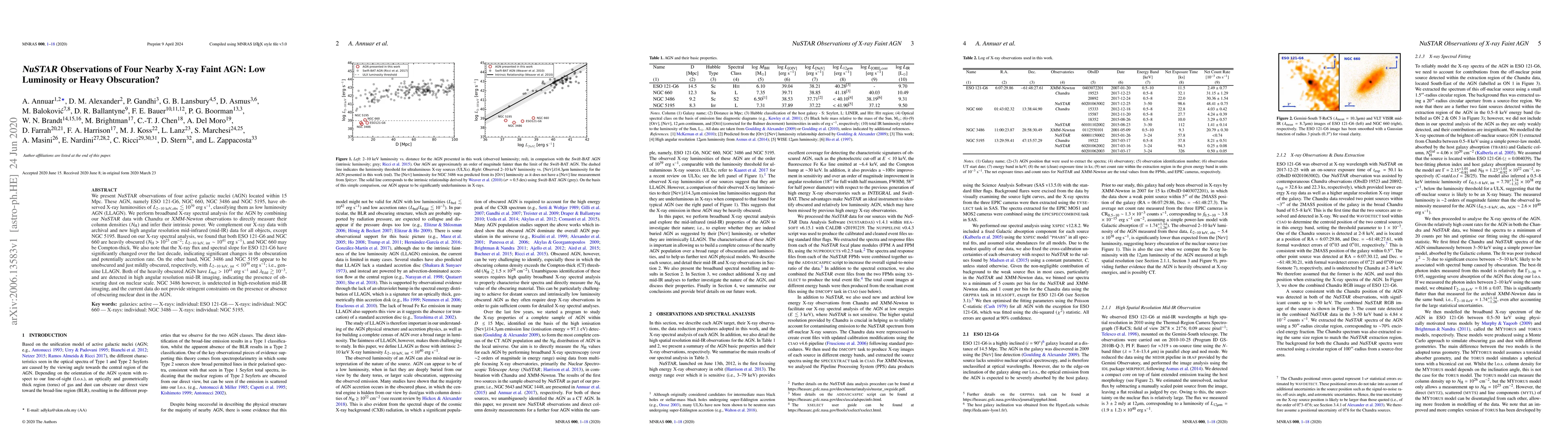 We present $NuSTAR$ observations of four active galactic nuclei (AGN) located within 15 Mpc. These AGN, namely ESO 121-G6, NGC 660, NGC 3486 and NGC 5195, have observed X-ray luminosities of $L_{\rm 2-10\ keV, obs} \lesssim$ 10$^{39}$ erg s$^{-1}$, classifying them as low luminosity AGN (LLAGN). We perform broadband X-ray spectral analysis for the AGN by combining our $NuSTAR$ data with $Chandra$ or $XMM-Newton$ observations to directly measure their column densities ($N_{\rm H}$) and infer their intrinsic power. We complement our X-ray data with archival and new high angular resolution mid-infrared (mid-IR) data for all objects, except NGC 5195. Based on our X-ray spectral analysis, we found that both ESO 121-G6 and NGC 660 are heavily obscured ($N_{\rm H}$ > 10$^{23}$ cm$^{-2}$; $L_{\rm 2-10\ keV,\ int} \sim$ 10$^{41}$ erg s$^{-1}$), and NGC 660 may be Compton-thick. We also note that the X-ray flux and spectral slope for ESO 121-G6 have significantly changed over the last decade, indicating significant changes in the obscuration and potentially accretion rate. On the other hand, NGC 3486 and NGC 5195 appear to be unobscured and just mildly obscured, respectively, with $L_{\rm 2-10\ keV,\ int} <$ 10$^{39}$ erg s$^{-1}$; i.e., genuine LLAGN. Both of the heavily obscured AGN have $L_{\rm bol} >$ 10$^{41}$ erg s$^{-1}$ and $\lambda_{\rm Edd} \gtrsim$ 10$^{-3}$, and are detected in high angular resolution mid-IR imaging, indicating the presence of obscuring dust on nuclear scale. NGC 3486 however, is undetected in high-resolution mid-IR imaging, and the current data do not provide stringent constraints on the presence or absence of obscuring nuclear dust in the AGN.