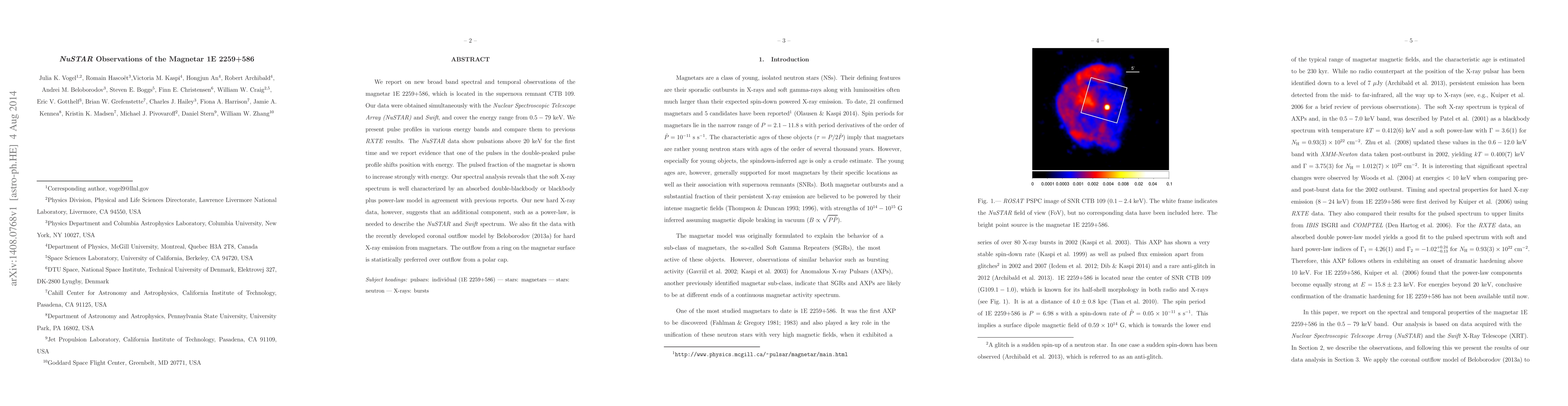 We report on new broad band spectral and temporal observations of the magnetar 1E 2259+586, which is located in the supernova remnant CTB 109. Our data were obtained simultaneously with the Nuclear Spectroscopic Telescope Array (NuSTAR) and Swift, and cover the energy range from 0.5-79 keV. We present pulse profiles in various energy bands and compare them to previous RXTE results. The NuSTAR data show pulsations above 20 keV for the first time and we report evidence that one of the pulses in the double-peaked pulse profile shifts position with energy. The pulsed fraction of the magnetar is shown to increase strongly with energy. Our spectral analysis reveals that the soft X-ray spectrum is well characterized by an absorbed double-blackbody or blackbody plus power-law model in agreement with previous reports. Our new hard X-ray data, however, suggests that an additional component, such as a power-law, is needed to describe the NuSTAR and Swift spectrum. We also fit the data with the recently developed coronal outflow model by Beloborodov for hard X-ray emission from magnetars. The outflow from a ring on the magnetar surface is statistically preferred over outflow from a polar cap.