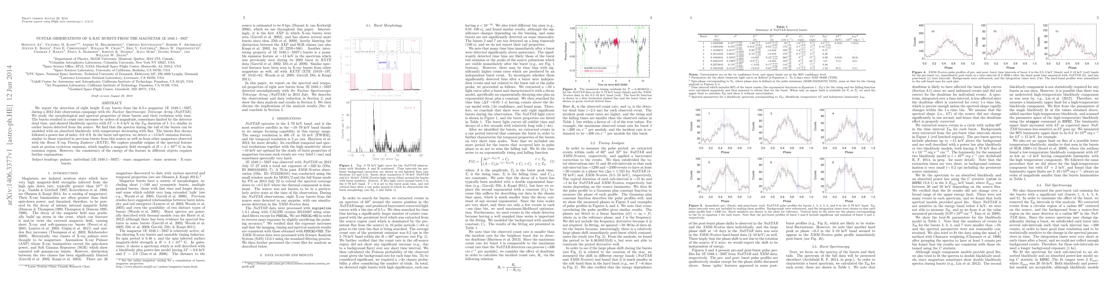 We report the detection of eight bright X-ray bursts from the 6.5-s magnetar 1E 1048.1-5937, during a 2013 July observation campaign with the Nuclear Spectroscopic Telescope Array (NuSTAR). We study the morphological and spectral properties of these bursts and their evolution with time. The bursts resulted in count rate increases by orders of magnitude, sometimes limited by the detector dead time, and showed blackbody spectra with kT=6-8 keV in the T90 duration of 1-4 s, similar to earlier bursts detected from the source. We find that the spectra during the tail of the bursts can be modeled with an absorbed blackbody with temperature decreasing with flux. The bursts flux decays followed a power-law of index 0.8-0.9. In the burst tail spectra, we detect a ~13 keV emission feature, similar to those reported in previous bursts from this source as well as from other magnetars observed with the Rossi X-ray Timing Explorer (RXTE). We explore possible origins of the spectral feature such as proton cyclotron emission, which implies a magnetic field strength of B~2X10^15 G in the emission region. However, the consistency of the energy of the feature in different objects requires further explanation.