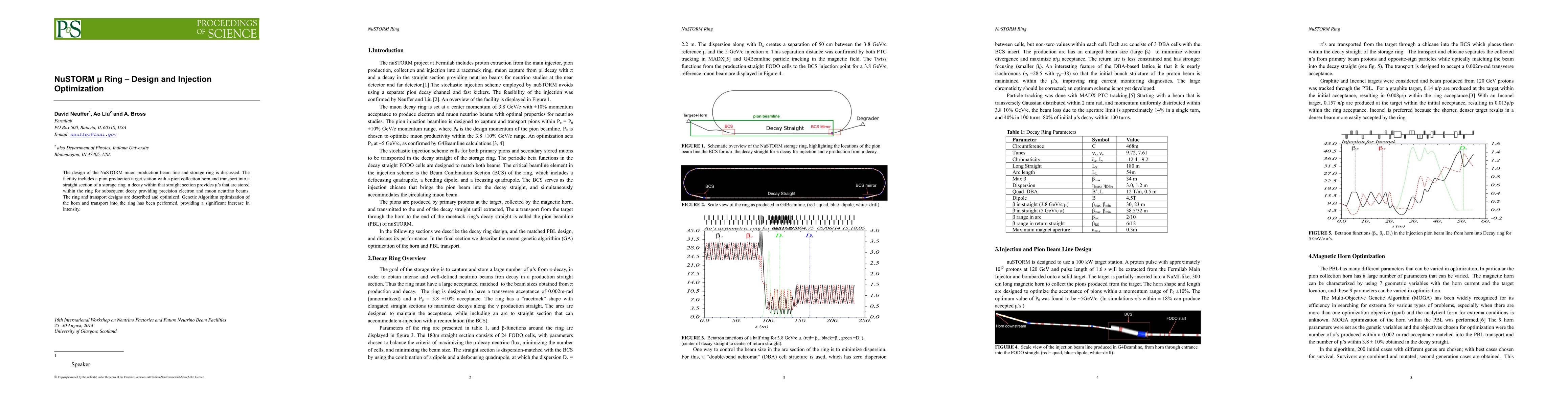 The NuSTORM muon storage ring design and injection optimization focus on producing and storing muons for precision electron and muon neutrino beams, with genetic algorithm optimization enhancing the efficiency of the pion production and transport process.