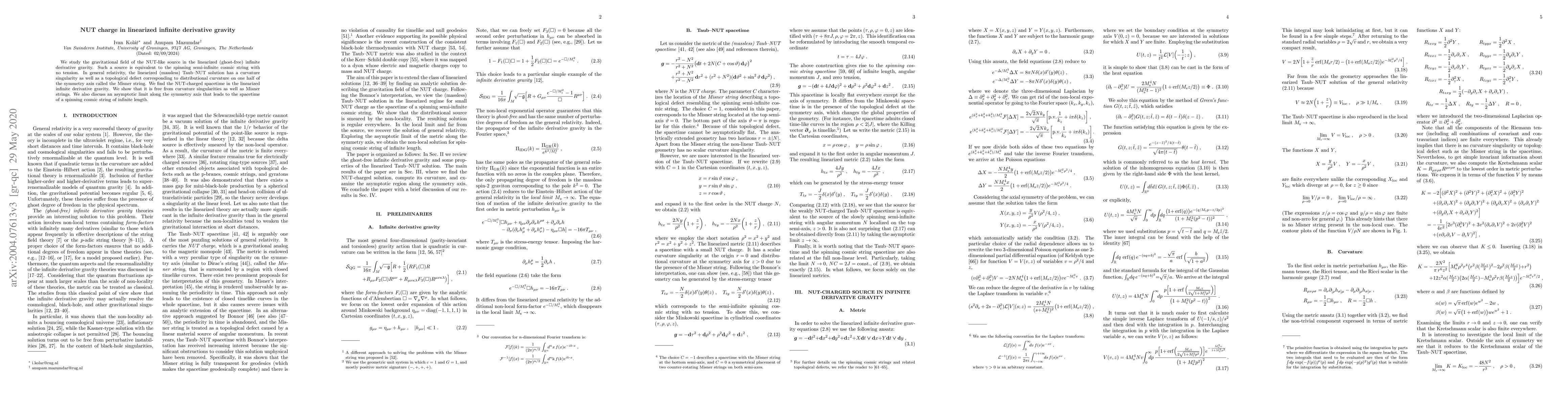 This paper investigates the gravitational field of a NUT-like source in linearized infinite derivative gravity, demonstrating that the resulting NUT-charged spacetime lacks curvature singularities and Misner strings, unlike the corresponding solution in general relativity. It also explores an asymptotic limit that results in a spinning cosmic string of infinite length.