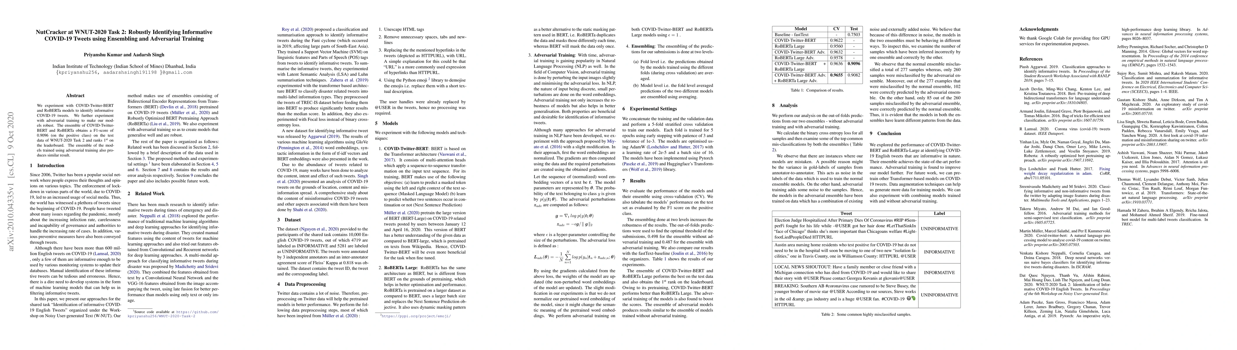We experiment with COVID-Twitter-BERT and RoBERTa models to identify informative COVID-19 tweets. We further experiment with adversarial training to make our models robust. The ensemble of COVID-Twitter-BERT and RoBERTa obtains a F1-score of 0.9096 (on the positive class) on the test data of WNUT-2020 Task 2 and ranks 1st on the leaderboard. The ensemble of the models trained using adversarial training also produces similar result.