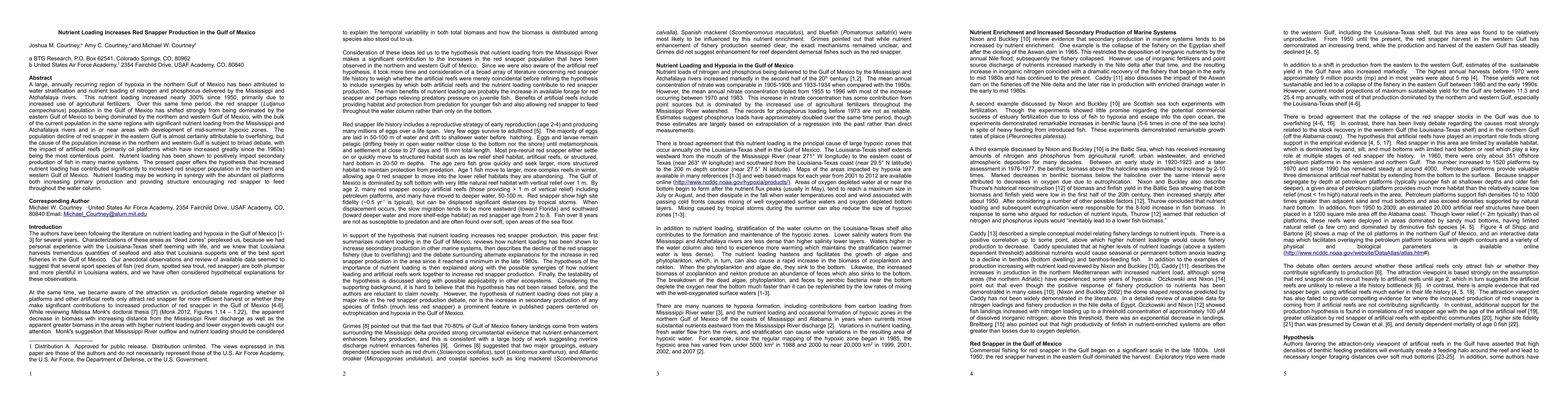 This study hypothesizes that increased nutrient loading from agricultural fertilizers has significantly boosted the red snapper population in the northern and western Gulf of Mexico, where nutrient-driven primary production and artificial reefs likely synergize to enhance fish growth and habitat availability. The population decline in the eastern Gulf is primarily due to overfishing.