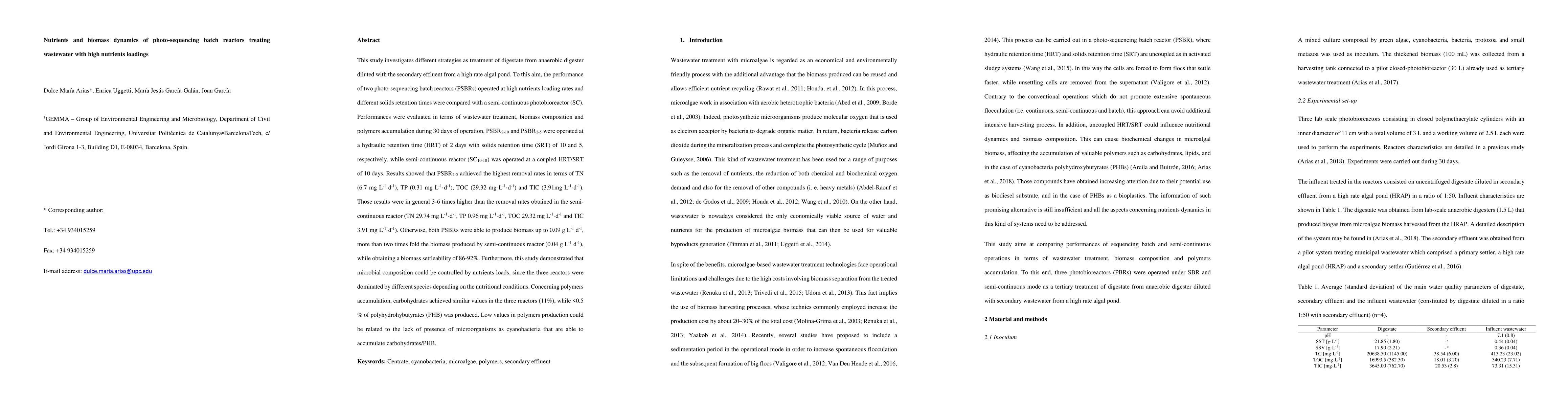 The present study investigates different strategies for the treatment of a mixture of digestate from an anaerobic digester diluted and secondary effluent from a high rate algal pond. To this aim, the performance of two photo-sequencing batch reactors (PSBRs) operated at high nutrients loading rates and different solids retention times (SRTs) were compared with a semi-continuous photobioreactor (SC). Performances were evaluated in terms of wastewater treatment, biomass composition and biopolymers accumulation during 30 days of operation. PSBRs were operated at a hydraulic retention time (HRT) of 2 days and SRTs of 10 and 5 days (PSBR2-10 and PSBR2-5, respectively), whereas the semi-continuous reactor was operated at a coupled HRT/SRT of 10 days (SC10-10). Results showed that PSBR2-5 achieved the highest removal rates in terms of TN (6.7 mg L-1 d-1), TP (0.31 mg L-1 d-1), TOC (29.32 mg L-1 d-1) and TIC (3.91 mg L-1 d-1). These results were in general 3-6 times higher than the removal rates obtained in the SC10-10 (TN 29.74 mg L-1 d-1, TP 0.96 mg L-1 d-1, TOC 29.32 mg L-1 d-1 and TIC 3.91 mg L-1 d-1). Furthermore, both PSBRs were able to produce biomass up to 0.09 g L-1 d-1, more than twofold the biomass produced by the semi-continuous reactor (0.04 g L-1 d-1), and achieved a biomass settleability of 86-92%. This study also demonstrated that the microbial composition could be controlled by the nutrients loads, since the three reactors were dominated by different species depending on the nutritional conditions. Concerning biopolymers accumulation, carbohydrates concentration achieved similar values in the three reactors (11%), whereas <0.5 % of polyhydrohybutyrates (PHB) was produced. These low values in biopolymers production could be related to the lack of microorganisms as cyanobacteria that are able to accumulate carbohydrates/PHB.