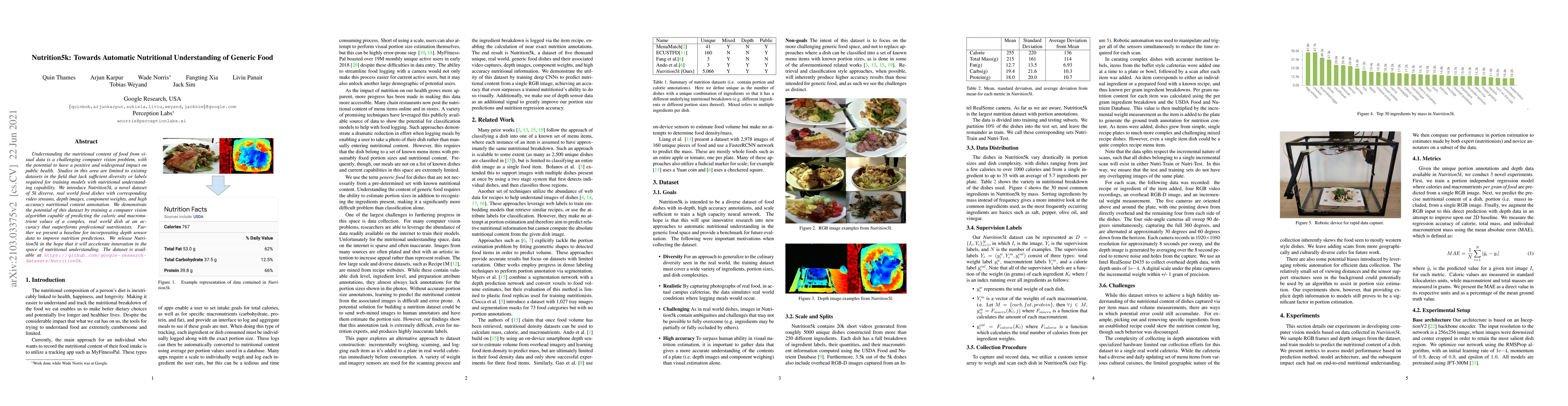 Understanding the nutritional content of food from visual data is a challenging computer vision problem, with the potential to have a positive and widespread impact on public health. Studies in this area are limited to existing datasets in the field that lack sufficient diversity or labels required for training models with nutritional understanding capability. We introduce Nutrition5k, a novel dataset of 5k diverse, real world food dishes with corresponding video streams, depth images, component weights, and high accuracy nutritional content annotation. We demonstrate the potential of this dataset by training a computer vision algorithm capable of predicting the caloric and macronutrient values of a complex, real world dish at an accuracy that outperforms professional nutritionists. Further we present a baseline for incorporating depth sensor data to improve nutrition predictions. We will publicly release Nutrition5k in the hope that it will accelerate innovation in the space of nutritional understanding.