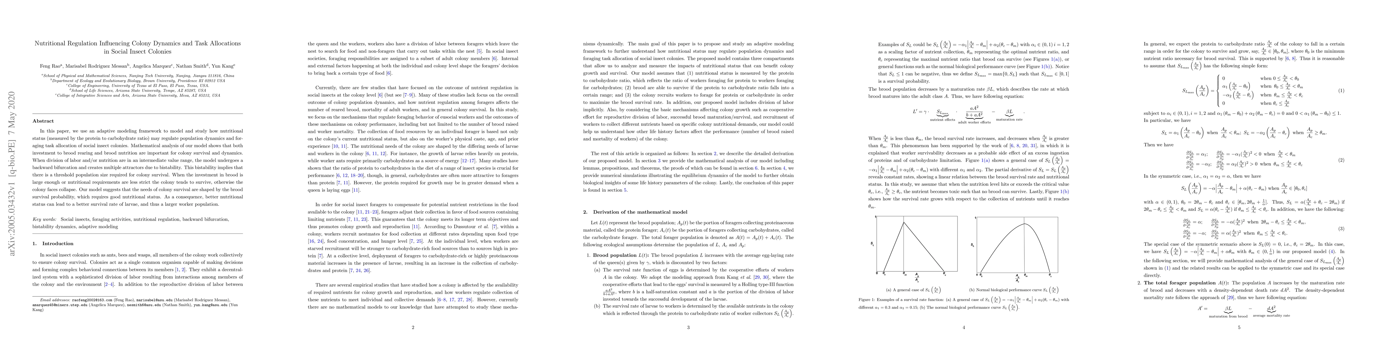 In this paper, we use an adaptive modeling framework to model and study how nutritional status (measured by the protein to carbohydrate ratio) may regulate population dynamics and foraging task allocation of social insect colonies. Mathematical analysis of our model shows that both investment to brood rearing and brood nutrition are important for colony survival and dynamics. When division of labor and/or nutrition are in an intermediate value range, the model undergoes a backward bifurcation and creates multiple attractors due to bistability. This bistability implies that there is a threshold population size required for colony survival. When the investment in brood is large enough or nutritional requirements are less strict the colony tends to survive, otherwise the colony faces collapse. Our model suggests that the needs of colony survival are shaped by the brood survival probability, which requires good nutritional status. As a consequence, better nutritional status can lead to a better survival rate of larvae, and thus a larger worker population.