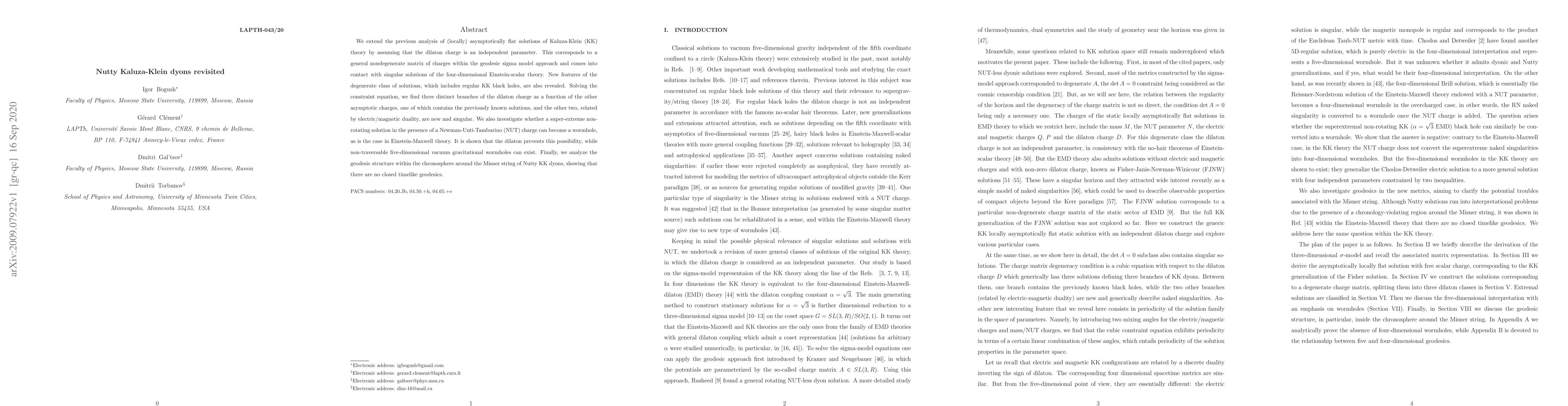 We extend the previous analysis of (locally) asymptotically flat solutions of Kaluza-Klein (KK) theory by assuming that the dilaton charge is an independent parameter. This corresponds to a general nondegenerate matrix of charges within the geodesic sigma model approach and comes into contact with singular solutions of the four-dimensional Einstein-scalar theory. New features of the degenerate class of solutions, which includes regular KK black holes, are also revealed. Solving the constraint equation, we find three distinct branches of the dilaton charge as a function of the other asymptotic charges, one of which contains the previously known solutions, and the other two, related by electric/magnetic duality, are new and singular. We also investigate whether a super-extreme non-rotating solution in the presence of a Newman-Unti-Tamburino (NUT) charge can become a wormhole, as is the case in Einstein-Maxwell theory. It is shown that the dilaton prevents this possibility, while non-traversable five-dimensional vacuum gravitational wormholes can exist. Finally, we analyze the geodesic structure within the chronosphere around the Misner string of Nutty KK dyons, showing that there are no closed timelike geodesics.