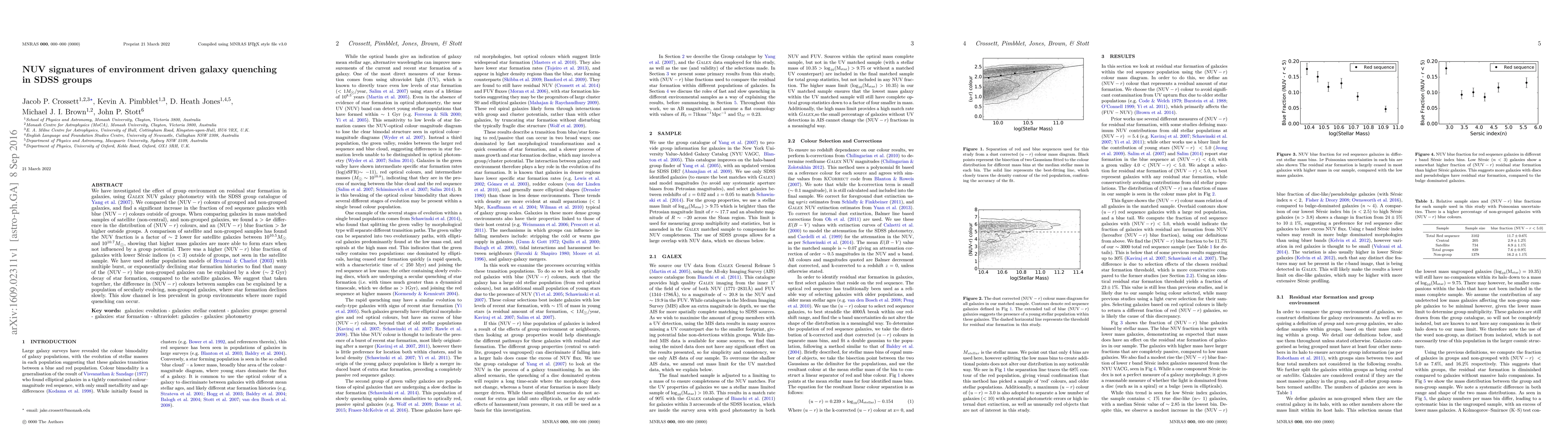 We have investigated the effect of group environment on residual star formation in galaxies, using Galex NUV galaxy photometry with the SDSS group catalogue of Yang et al. (2007). We compared the (NUV $- r$) colours of grouped and non-grouped galaxies, and find a significant increase in the fraction of red sequence galaxies with blue (NUV $- r$) colours outside of groups. When comparing galaxies in mass matched samples of satellite (non-central), and non-grouped galaxies, we found a > 4{\sigma} difference in the distribution of (NUV $- r$) colours, and an (NUV $- r$) blue fraction $> 3{\sigma}$ higher outside groups. A comparison of satellite and non-grouped samples has found the NUV fraction is a factor of $\sim2$ lower for satellite galaxies between $10^{10.5}M_{\bigodot}$ and $10^{10.7}M_{\bigodot}$, showing that higher mass galaxies are more able to form stars when not influenced by a group potential. There was a higher (NUV $- r$) blue fraction of galaxies with lower Sersic indices (n < 3) outside of groups, not seen in the satellite sample. We have used stellar population models of Bruzual & Charlot (2003) with multiple burst, or exponentially declining star formation histories to find that many of the (NUV $- r$) blue non-grouped galaxies can be explained by a slow ($\sim 2$ Gyr) decay of star formation, compared to the satellite galaxies. We suggest that taken together, the difference in (NUV $- r$) colours between samples can be explained by a population of secularly evolving, non-grouped galaxies, where star formation declines slowly. This slow channel is less prevalent in group environments where more rapid quenching can occur.