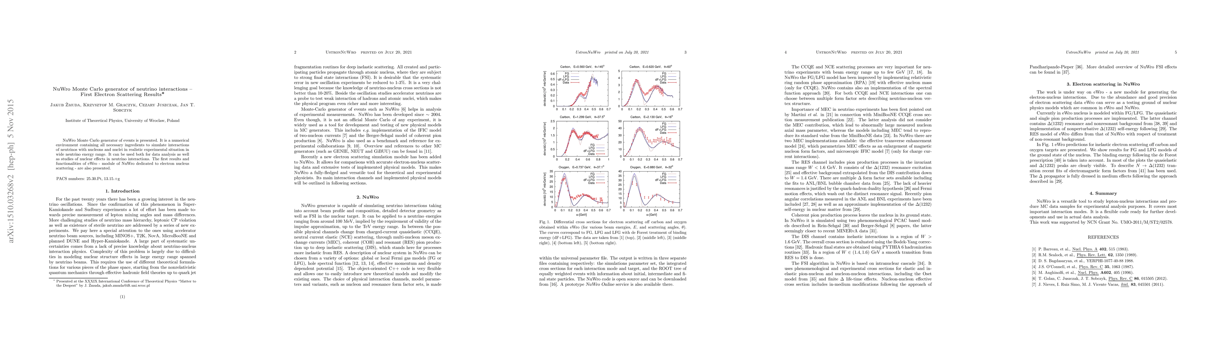 NuWro Monte Carlo generator of events is presented. It is a numerical environment containing all necessary ingredients to simulate interactions of neutrinos with nucleons and nuclei in realistic experimental situation in wide neutrino energy range. It can be used both for data analysis as well as studies of nuclear effects in neutrino interactions. The first results and functionalities of eWro - module of NuWro dedicated to electron nucleus scattering - are also presented.