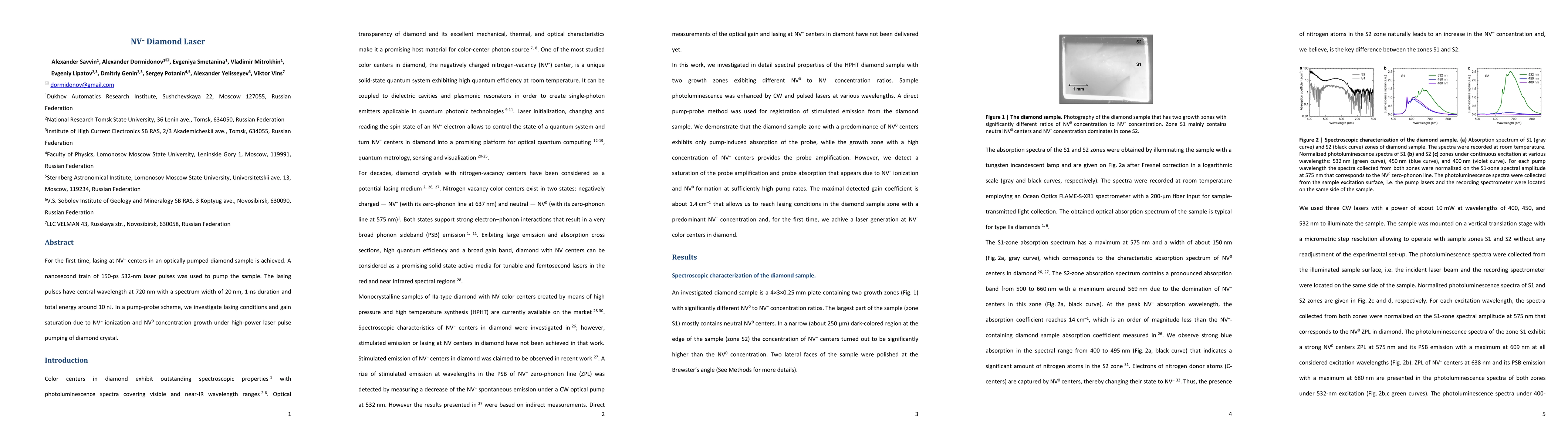 The paper reports the first successful lasing at NV$^{-}$ centers in an optically pumped diamond sample using a nanosecond laser, achieving 1-ns pulses at 720 nm with 10 nJ energy. The study investigates lasing conditions and gain saturation due to NV$^{-}$ ionization under high-power laser pumping.