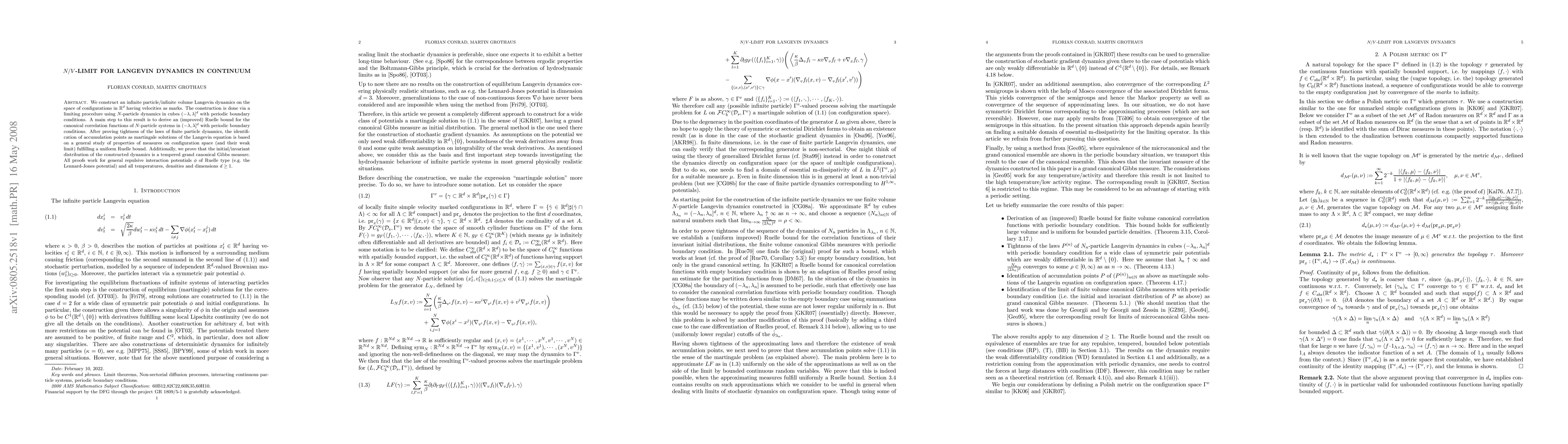 We construct an infinite particle/infinite volume Langevin dynamics on the space of configurations in $\R^d$ having velocities as marks. The construction is done via a limiting procedure using $N$-particle dynamics in cubes $(-\lambda,\lambda]^d$ with periodic boundary conditions. A main step to this result is to derive an (improved) Ruelle bound for the canonical correlation functions of $N$-particle systems in $(-\lambda,\lambda]^d$ with periodic boundary conditions. After proving tightness of the laws of finite particle dynamics, the identification of accumulation points as martingale solutions of the Langevin equation is based on a general study of properties of measures on configuration space (and their weak limit) fulfilling a uniform Ruelle bound. Additionally, we prove that the initial/invariant distribution of the constructed dynamics is a tempered grand canonical Gibbs measure. All proofs work for general repulsive interaction potentials $\phi$ of Ruelle type (e.g. the Lennard-Jones potential) and all temperatures, densities and dimensions $d\geq 1$.