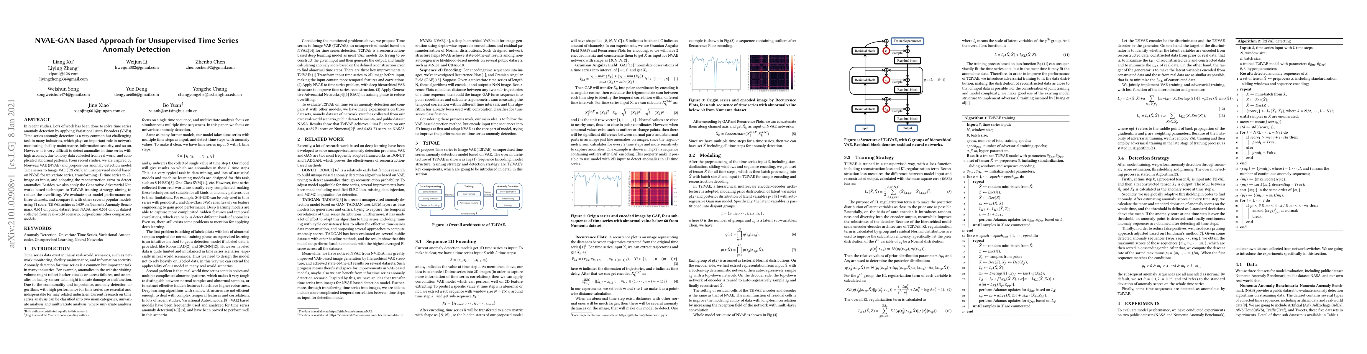 This paper proposes T2IVAE, an unsupervised time series anomaly detection model based on Nouveau VAE (NVAE) and Generative Adversarial Networks (GANs), transforming 1D time series into 2D images for improved anomaly detection. The model outperforms other methods on three datasets, achieving F1 scores of 0.639, 0.651, and 0.504 respectively.