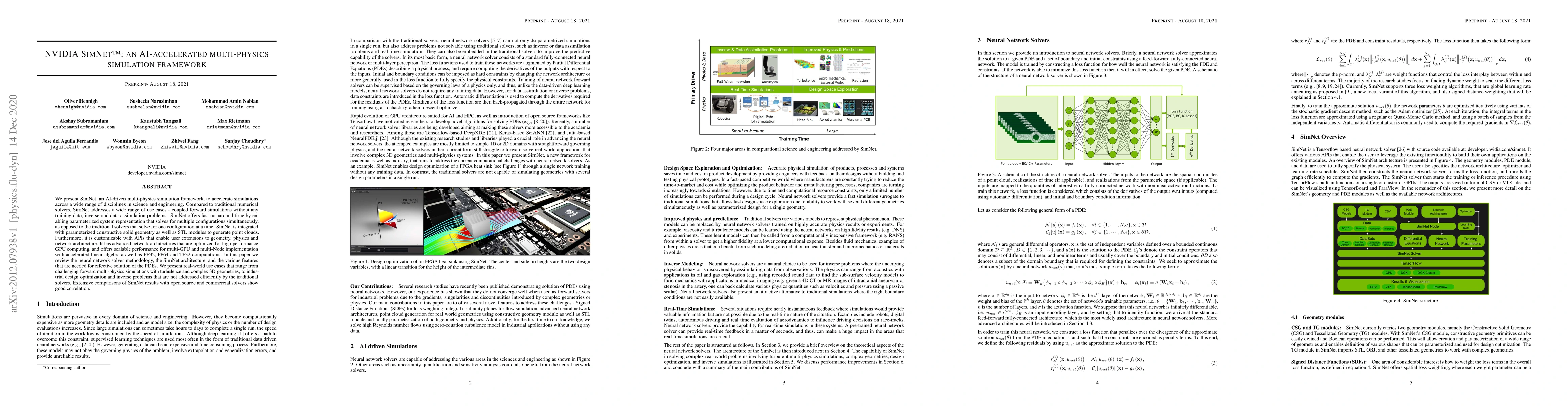 SimNet, an AI-driven multi-physics simulation framework, is presented. It uses neural network solvers for a wide range of use cases including forward simulations, inverse problems, and data assimilation. SimNet offers fast turnaround time through parameterized system representation, solving multiple configurations simultaneously. It integrates with CSG and STL modules for geometry generation and is customizable with APIs for user extensions to geometry, physics, and network architecture.