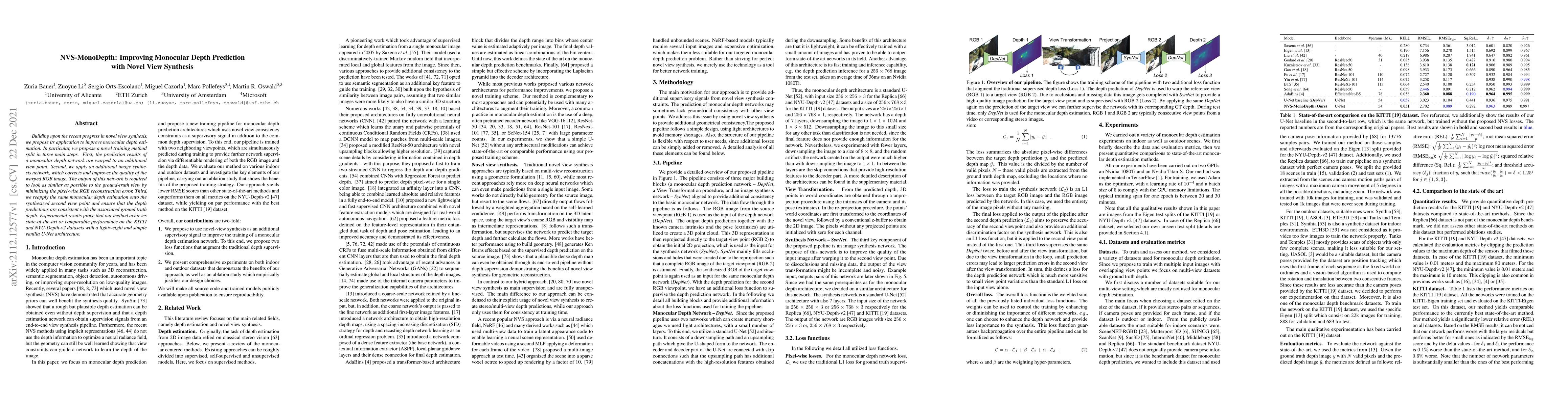 The paper proposes a novel training method to enhance monocular depth prediction using novel view synthesis, achieving state-of-the-art results on KITTI and NYU-Depth-v2 datasets. The method involves warping depth predictions to an additional view, synthesizing a corrected image, and re-estimating depth on the synthesized view to ensure consistency.