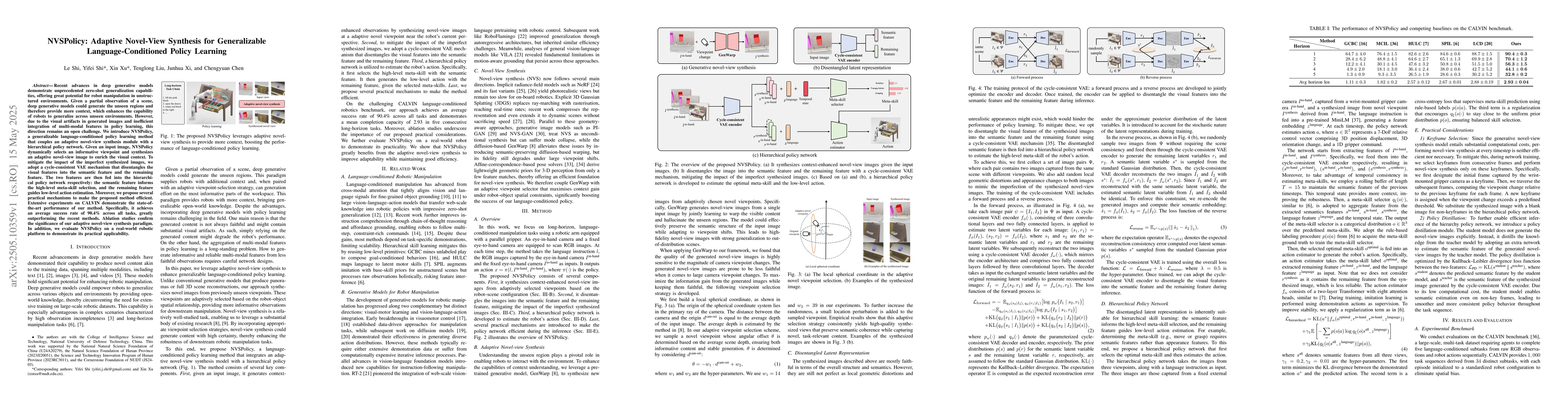 This paper introduces NVSPolicy, a method that enhances zero-shot generalization in robot manipulation by combining adaptive novel-view synthesis with hierarchical policy learning. It achieves state-of-the-art performance on the CALVIN benchmark with an average success rate of 90.4%.
