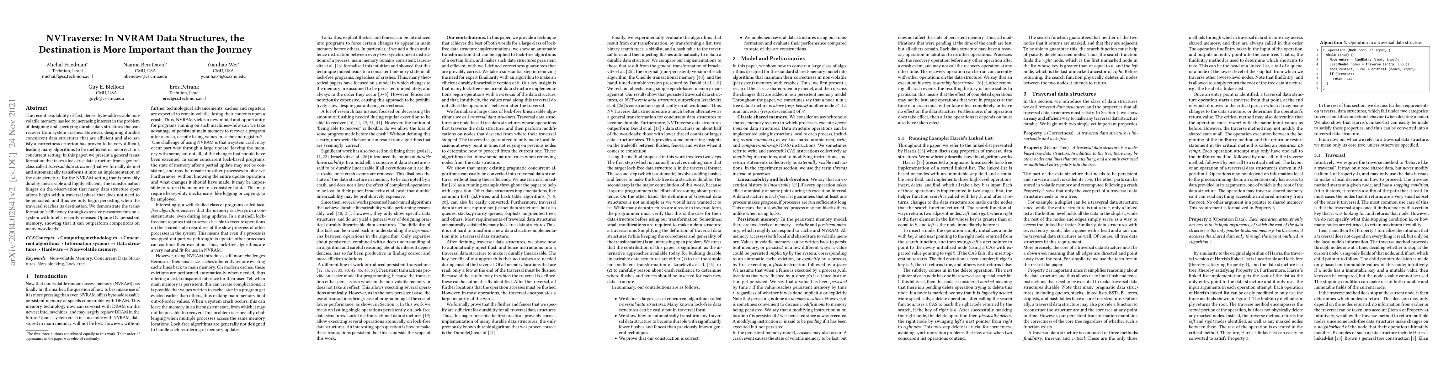 This paper introduces NVTraverse, a transformation method that converts lock-free traversal data structures into efficient, durable implementations for NVRAM. The approach focuses on persisting data only when necessary, achieving high efficiency and provable durability.