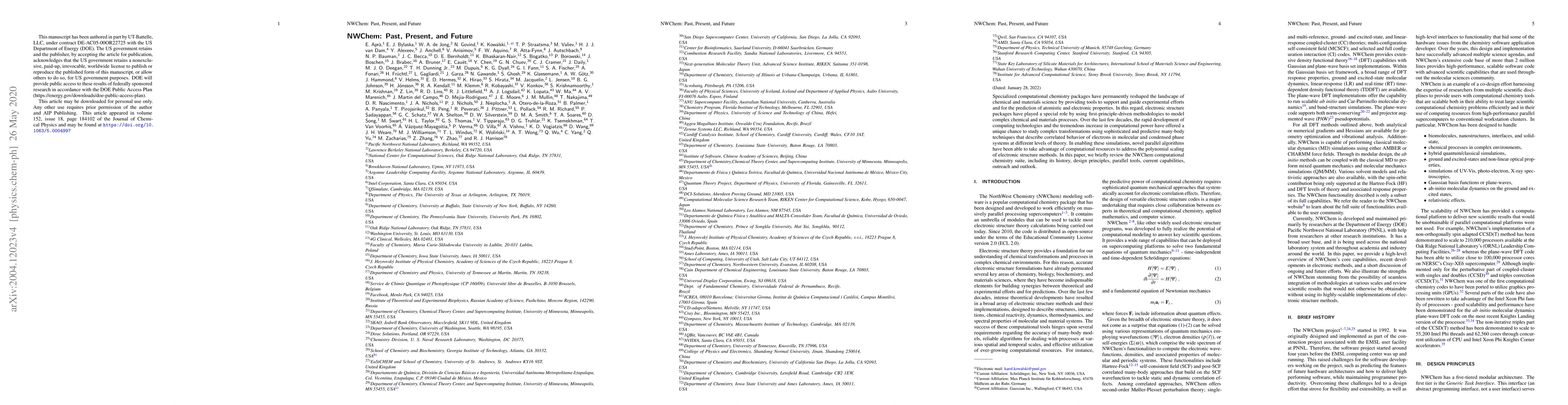 Specialized computational chemistry packages have permanently reshaped the landscape of chemical and materials science by providing tools to support and guide experimental efforts and for the prediction of atomistic and electronic properties. In this regard, electronic structure packages have played a special role by using first-principledriven methodologies to model complex chemical and materials processes. Over the last few decades, the rapid development of computing technologies and the tremendous increase in computational power have offered a unique chance to study complex transformations using sophisticated and predictive many-body techniques that describe correlated behavior of electrons in molecular and condensed phase systems at different levels of theory. In enabling these simulations, novel parallel algorithms have been able to take advantage of computational resources to address the polynomial scaling of electronic structure methods. In this paper, we briefly review the NWChem computational chemistry suite, including its history, design principles, parallel tools, current capabilities, outreach and outlook.
