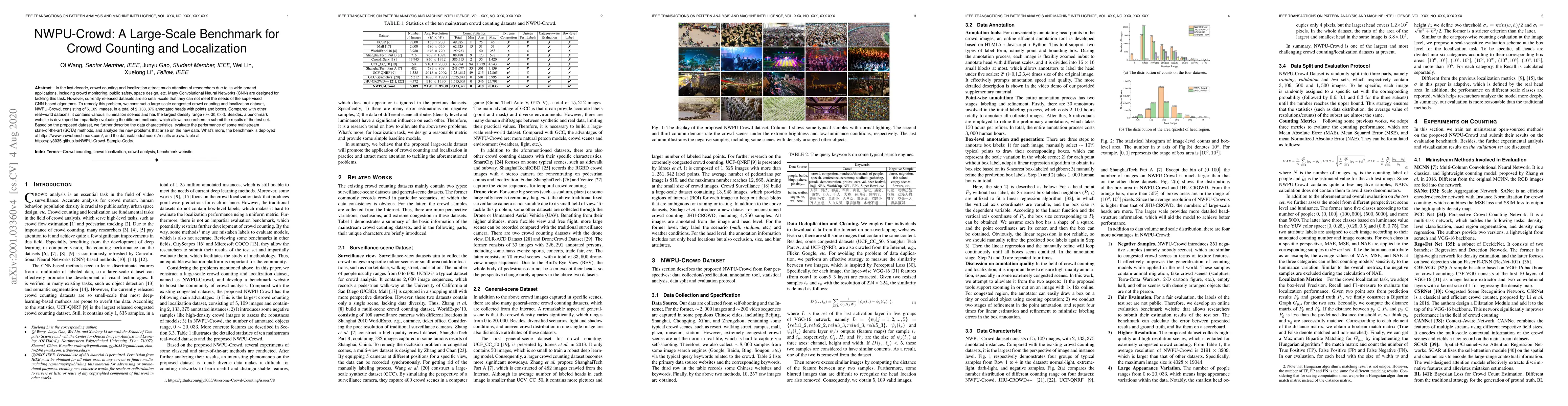 The paper introduces NWPU-Crowd, a large-scale benchmark dataset for crowd counting and localization, along with an online annotation tool and benchmark website for fair evaluation of different methods.