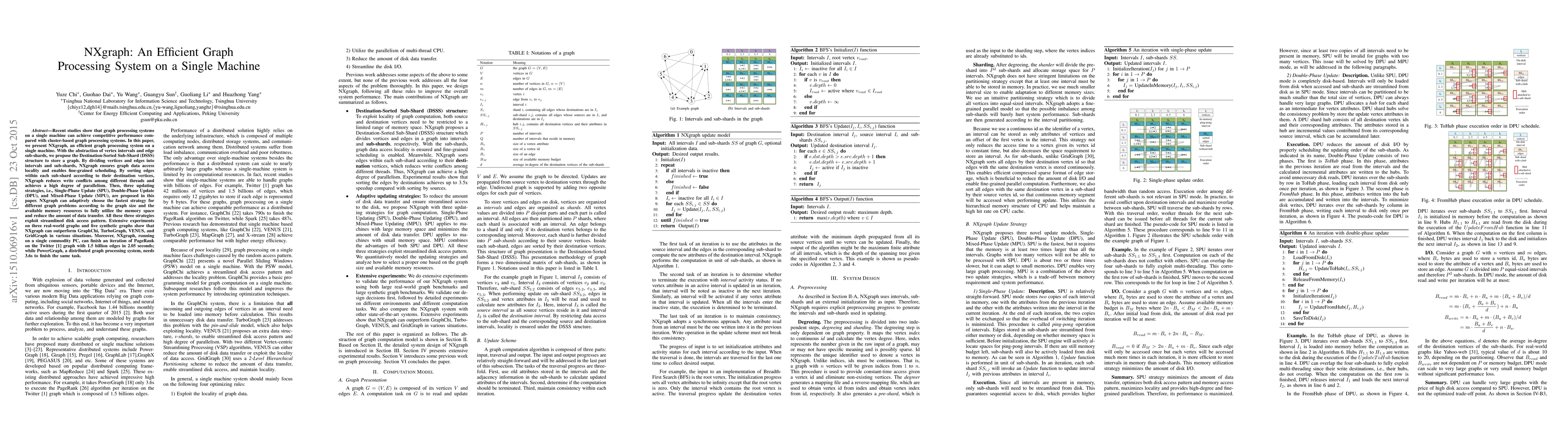 NXgraph is an efficient single-machine graph processing system that utilizes vertex intervals and edge sub-shards to enhance data locality and parallelism. It employs the Destination-Sorted Sub-Shard (DSSS) structure and adaptive updating strategies to outperform other systems, including distributed ones, on various graph processing tasks.