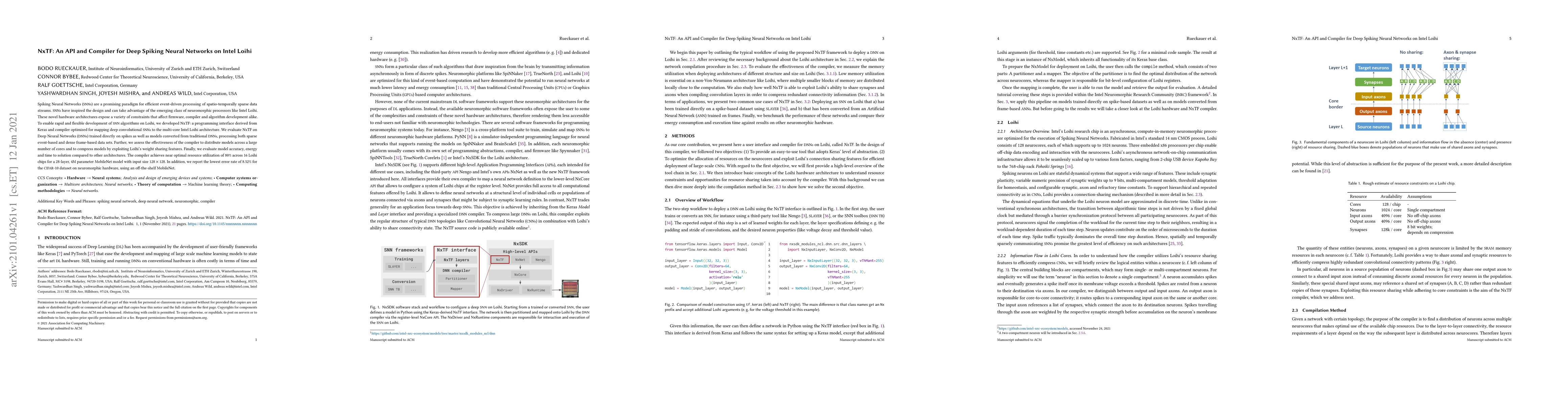 NxTF is a programming interface and compiler designed for developing deep convolutional Spiking Neural Networks (SNNs) on Intel Loihi. It enables efficient mapping of SNNs to the multi-core Loihi architecture, achieving near optimal resource utilization and low error rates on datasets like CIFAR-10.