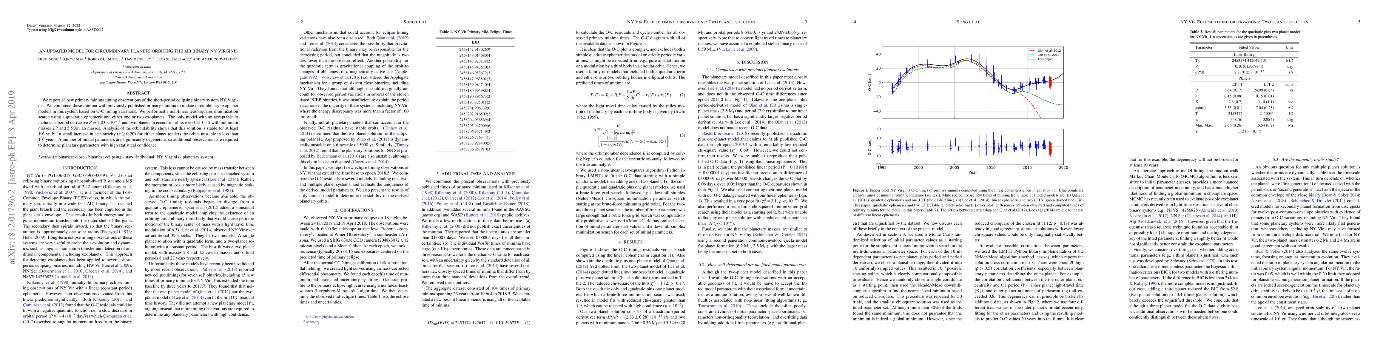 We report 18 new primary minima timing observations of the short-period eclipsing binary system NY Virginis. We combined these minima with previously published primary minima to update circumbinary exoplanet models in this system based on O-C timing variations. We performed a non-linear least-squares minimization search using a quadratic ephemeris and either one or two exoplanets. The only model with an acceptable fit includes a period derivative $\dot{P} = 2.83\times10^{-12}$ and two planets in eccentric orbits $e = 0.15,0.15$ with minimum masses 2.7 and 5.5 Jovian masses. Analysis of the orbit stability shows that this solution is stable for at least $10^8$ yr, but a small increase in eccentricity ($e\geq0.20$) for either planet renders the orbits unstable in less than $10^6$ years. A number of model parameters are significantly degenerate, so additional observations are required to determine planetary parameters with high statistical confidence.