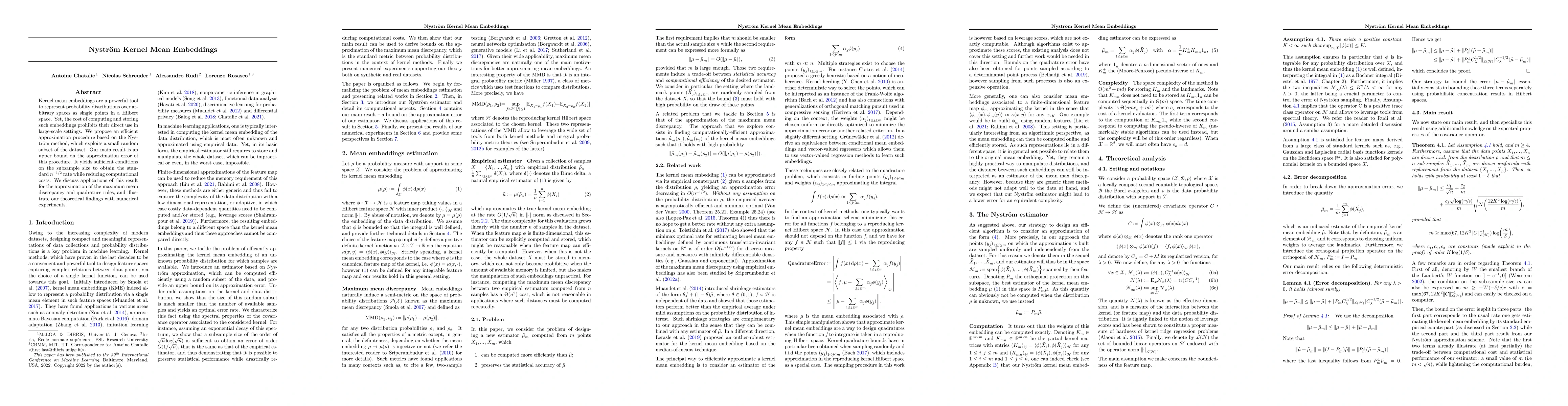 This paper proposes an efficient Nyström method for approximating kernel mean embeddings, reducing computational costs by using a small random subset of data. The authors provide an upper bound on the approximation error, ensuring the $n^{-1/2}$ rate, and demonstrate applications in maximum mean discrepancy and quadrature rules with numerical experiments.