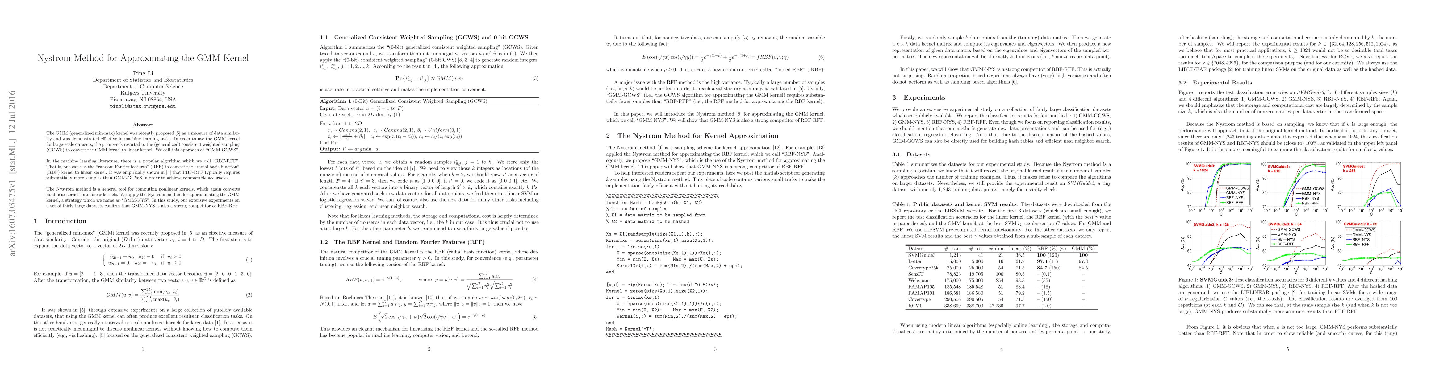 The paper proposes using the Nystrom method to approximate the GMM kernel, termed GMM-NYS, and compares it to the GMM-GCWS and RBF-RFF approaches. Experiments show that GMM-NYS is competitive with RBF-RFF in accuracy while requiring fewer samples.