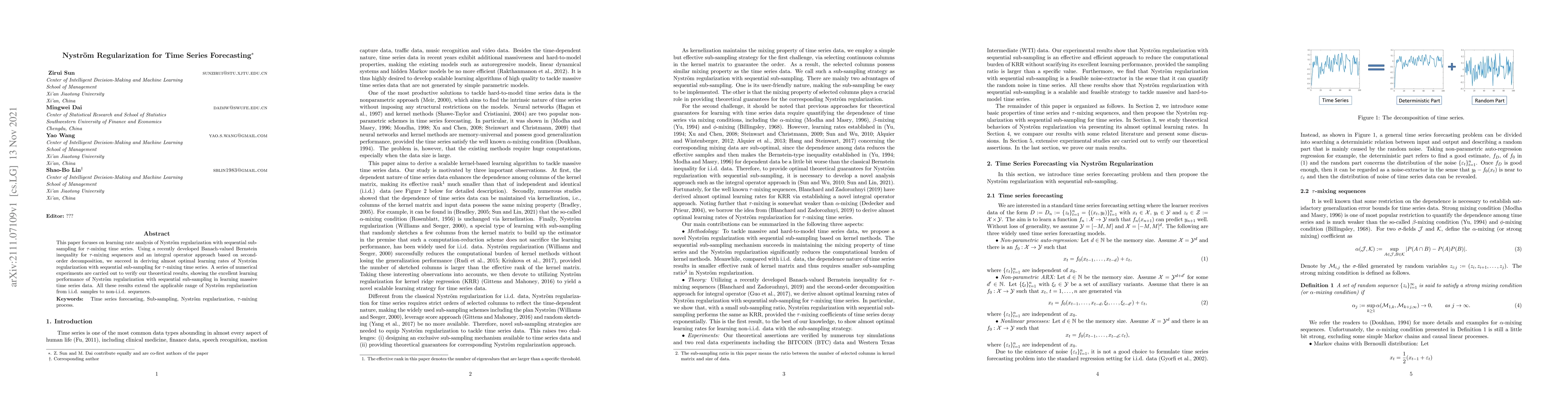 This paper analyzes the learning rate of Nyström regularization with sequential sub-sampling for $\tau$-mixing time series, deriving almost optimal rates using a Banach-valued Bernstein inequality and an integral operator approach. Numerical experiments confirm the method's effectiveness for massive time series data, extending Nyström regularization's applicability beyond i.i.d. samples.