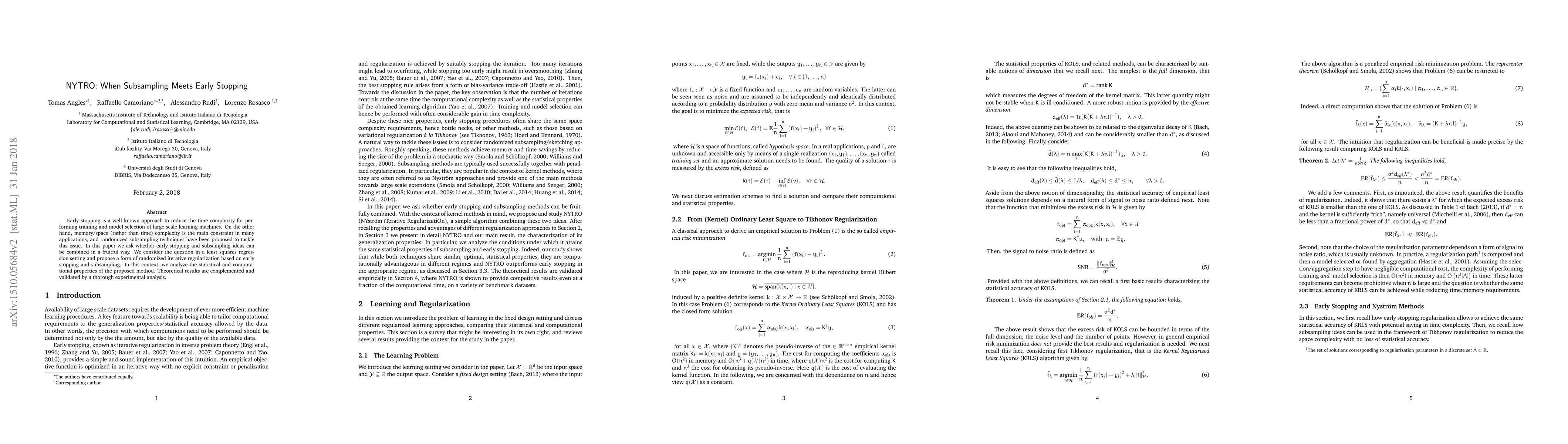 Early stopping is a well known approach to reduce the time complexity for performing training and model selection of large scale learning machines. On the other hand, memory/space (rather than time) complexity is the main constraint in many applications, and randomized subsampling techniques have been proposed to tackle this issue. In this paper we ask whether early stopping and subsampling ideas can be combined in a fruitful way. We consider the question in a least squares regression setting and propose a form of randomized iterative regularization based on early stopping and subsampling. In this context, we analyze the statistical and computational properties of the proposed method. Theoretical results are complemented and validated by a thorough experimental analysis.