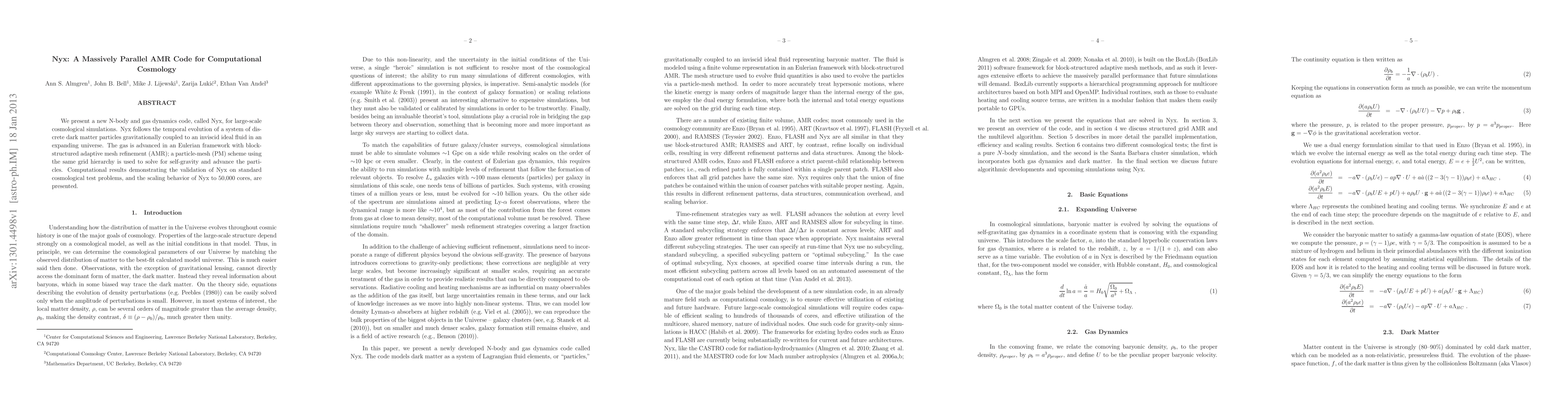 We present a new N-body and gas dynamics code, called Nyx, for large-scale cosmological simulations. Nyx follows the temporal evolution of a system of discrete dark matter particles gravitationally coupled to an inviscid ideal fluid in an expanding universe. The gas is advanced in an Eulerian framework with block-structured adaptive mesh refinement (AMR); a particle-mesh (PM) scheme using the same grid hierarchy is used to solve for self-gravity and advance the particles. Computational results demonstrating the validation of Nyx on standard cosmological test problems, and the scaling behavior of Nyx to 50,000 cores, are presented.