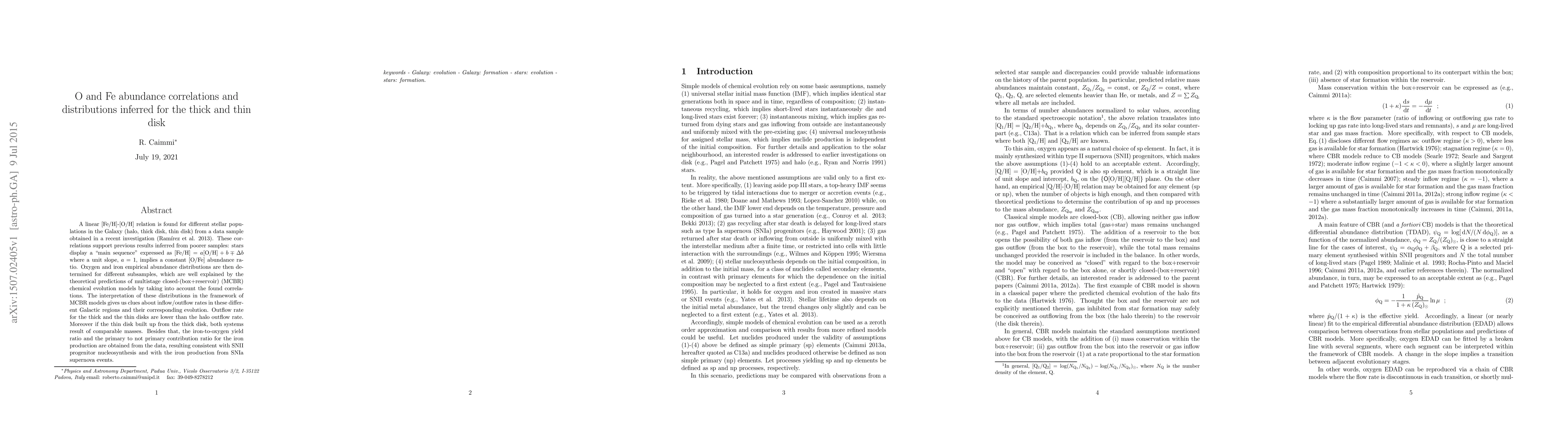 A linear [Fe/H]-[O/H] relation is found for different stellar populations in the Galaxy (halo, thick disk, thin disk) from a data sample obtained in a recent investigation (Ram{\'\i}rez et al. 2013). These correlations support previous results inferred from poorer samples: stars display a "main sequence" expressed as [Fe/H] = $a$[O/H$]+b\mp\Delta b$ where a unit slope, $a=1$, implies a constant [O/Fe] abundance ratio. Oxygen and iron empirical abundance distributions are then determined for different subsamples, which are well explained by the theoretical predictions of multistage closed-(box+reservoir) (MCBR) chemical evolution models by taking into account the found correlations. The interpretation of these distributions in the framework of MCBR models gives us clues about inflow/outflow rates in these different Galactic regions and their corresponding evolution. Outflow rate for the thick and the thin disks are lower than the halo outflow rate. Moreover if the thin disk built up from the thick disk, both systems result of comparable masses. Besides that, the iron-to-oxygen yield ratio and the primary to not primary contribution ratio for the iron production are obtained from the data, resulting consistent with SNII progenitor nucleosynthesis and with the iron production from SNIa supernova events.