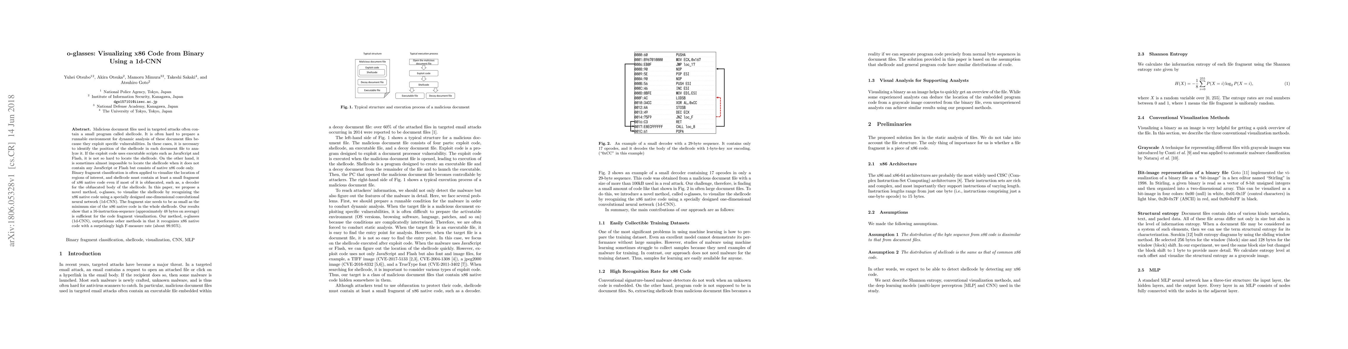 The paper proposes "o-glasses," a method using a 1d-CNN to visualize x86 shellcode in malicious document files by recognizing native code fragments. The method achieves a high F-measure rate of about 99.95%, demonstrating its effectiveness in identifying shellcode even when obfuscated.