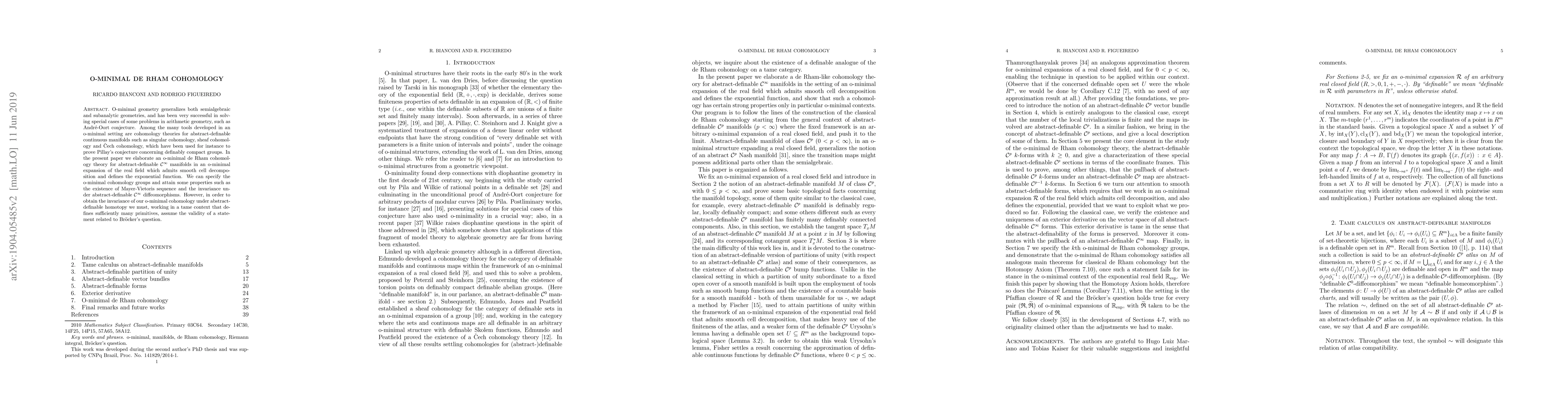This paper develops an o-minimal de Rham cohomology theory for abstract-definable smooth manifolds, establishing properties like Mayer-Vietoris sequences and invariance under diffeomorphisms, while assuming a statement related to Br\"ocker's question for homotopy invariance.