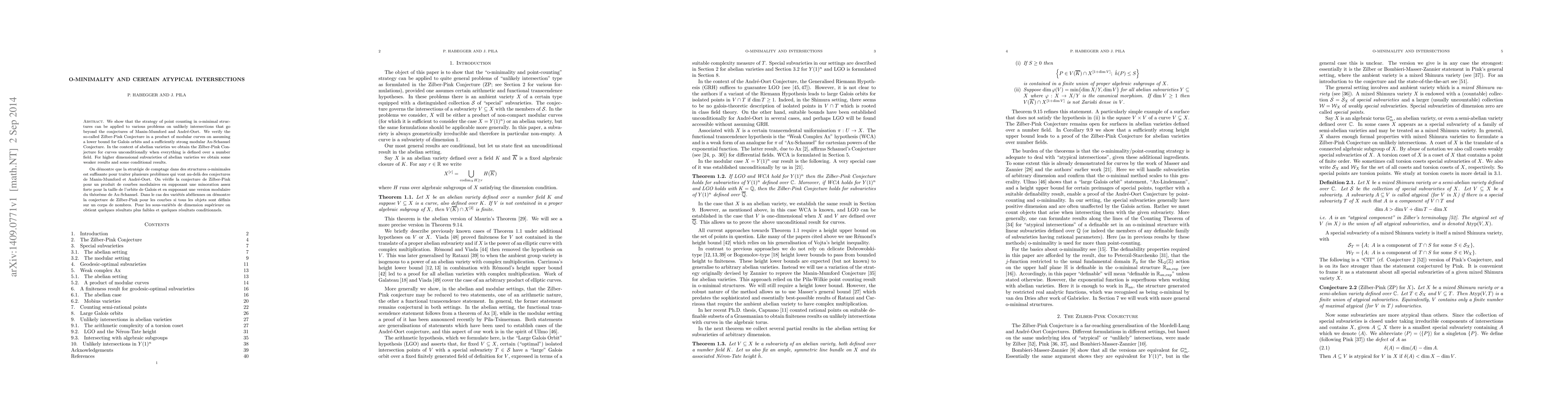 We show that the strategy of point counting in o-minimal structures can be applied to various problems on unlikely intersections that go beyond the conjectures of Manin-Mumford and Andr\'e-Oort. We verify the so-called Zilber-Pink Conjecture in a product of modular curves on assuming a lower bound for Galois orbits and a sufficiently strong modular Ax-Schanuel Conjecture. In the context of abelian varieties we obtain the Zilber-Pink Conjecture for curves unconditionally when everything is defined over a number field. For higher dimensional subvarieties of abelian varieties we obtain some weaker results and some conditional results.