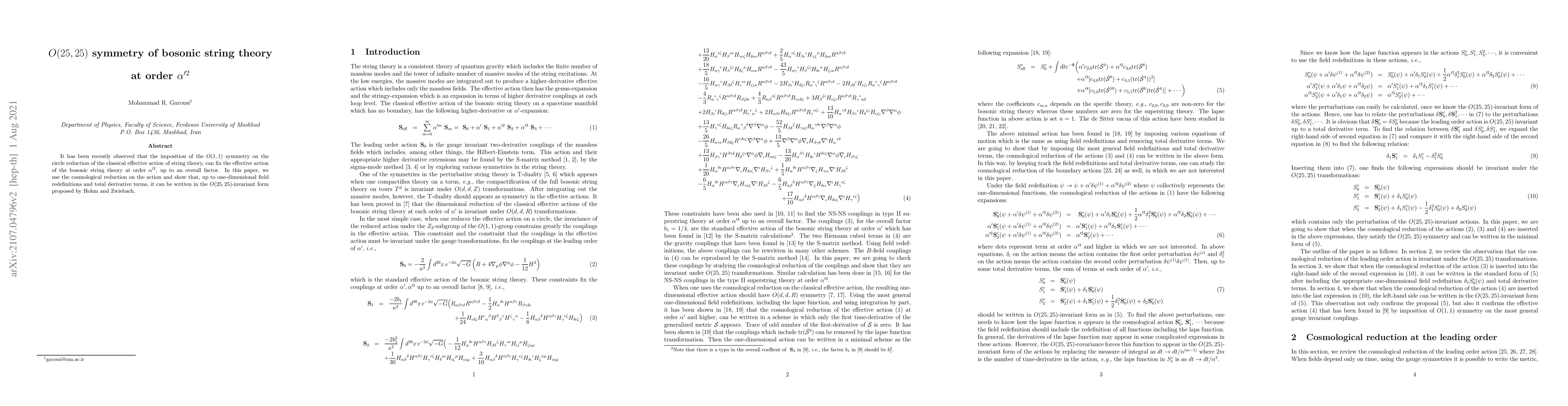 It has been recently observed that the imposition of the $O(1,1)$ symmetry on the circle reduction of the classical effective action of string theory, can fix the effective action of the bosonic string theory at order $\alpha'^2$, up to an overall factor. In this paper, we use the cosmological reduction on the action and show that, up to one-dimensional field redefinitions and total derivative terms, it can be written in the $O(25,25)$-invariant form proposed by Hohm and Zwiebach.