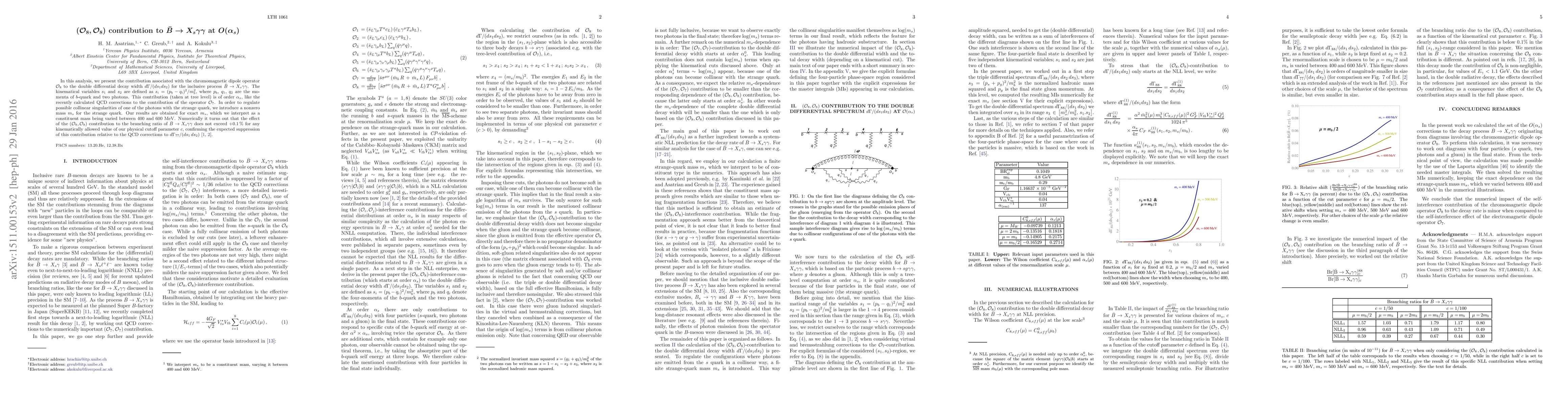 In this analysis, we present the contribution associated with the chromomagnetic dipole operator O_8 to the double differential decay width d\Gamma/(ds_1 ds_2) for the inclusive process $\bar{B} \to X_s \gamma \gamma$. The kinematical variables s_1 and s_2 are defined as s_i=(p_b - q_i)^2/m_b^2, where p_b, q_1, q_2 are the momenta of b-quark and two photons. This contribution (taken at tree level) is of order \alpha_s, like the recently calculated QCD corrections to the contribution of the operator O_7. In order to regulate possible collinear singularities of one of the photons with the strange quark, we introduce a non zero mass m_s for the strange quark. Our results are obtained for exact m_s, which we interpret as a constituent mass being varied between 400 and 600 MeV. Numerically it turns out that the effect of the (O_8, O_8) contribution to the branching ratio of $\bar{B} \to X_s \gamma \gamma$ does not exceed +0.1 % for any kinematically allowed value of our physical cutoff parameter c, confirming the expected suppression of this contribution relative to the QCD corrections to d\Gamma_{77}/(ds_1 ds_2).