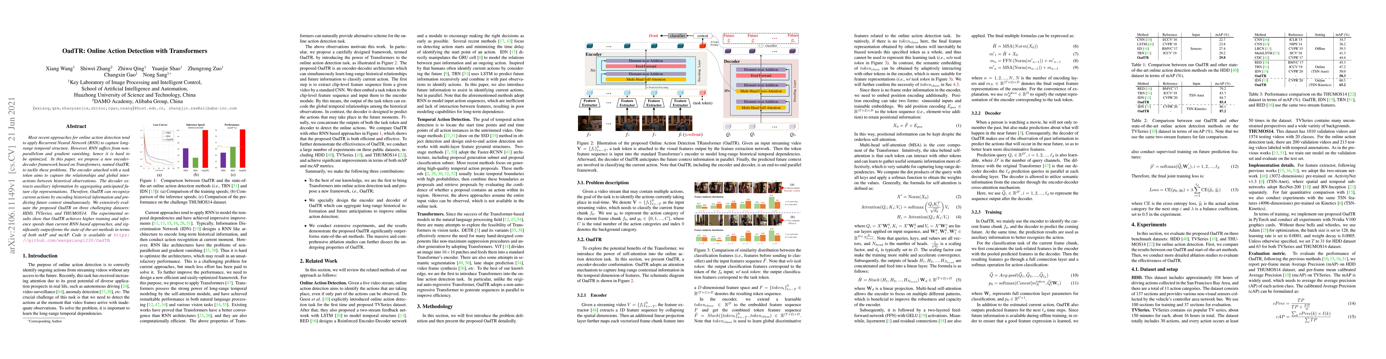 Most recent approaches for online action detection tend to apply Recurrent Neural Network (RNN) to capture long-range temporal structure. However, RNN suffers from non-parallelism and gradient vanishing, hence it is hard to be optimized. In this paper, we propose a new encoder-decoder framework based on Transformers, named OadTR, to tackle these problems. The encoder attached with a task token aims to capture the relationships and global interactions between historical observations. The decoder extracts auxiliary information by aggregating anticipated future clip representations. Therefore, OadTR can recognize current actions by encoding historical information and predicting future context simultaneously. We extensively evaluate the proposed OadTR on three challenging datasets: HDD, TVSeries, and THUMOS14. The experimental results show that OadTR achieves higher training and inference speeds than current RNN based approaches, and significantly outperforms the state-of-the-art methods in terms of both mAP and mcAP. Code is available at https://github.com/wangxiang1230/OadTR.