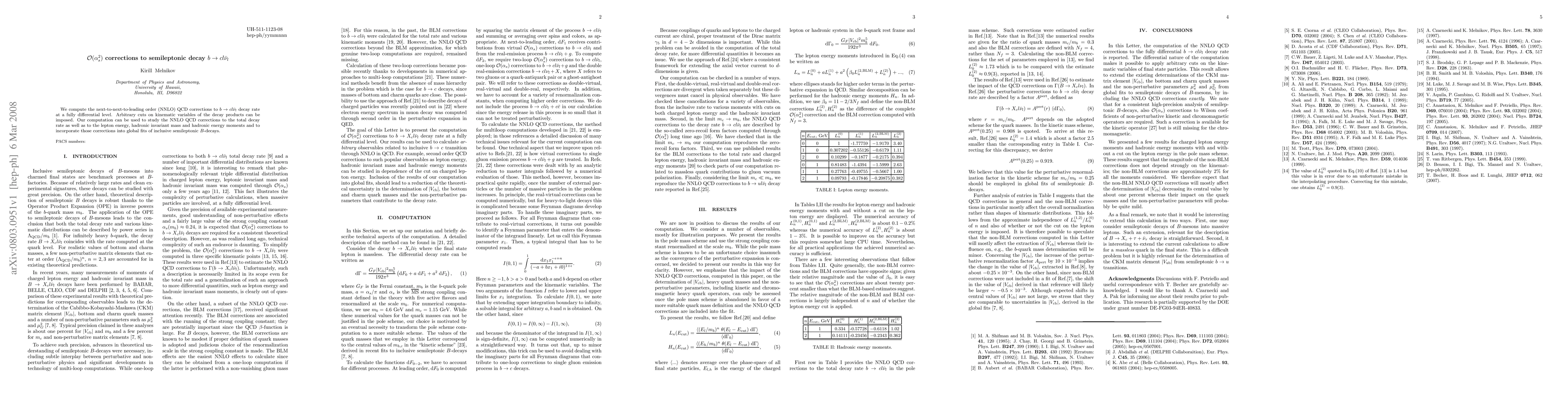 This paper calculates the next-to-next-to-leading order (NNLO) QCD corrections to the semileptonic decay b → c lν_l, providing a fully differential treatment. The results can be applied to various kinematic observables and can improve global fits for inclusive semileptonic B-decay processes.
