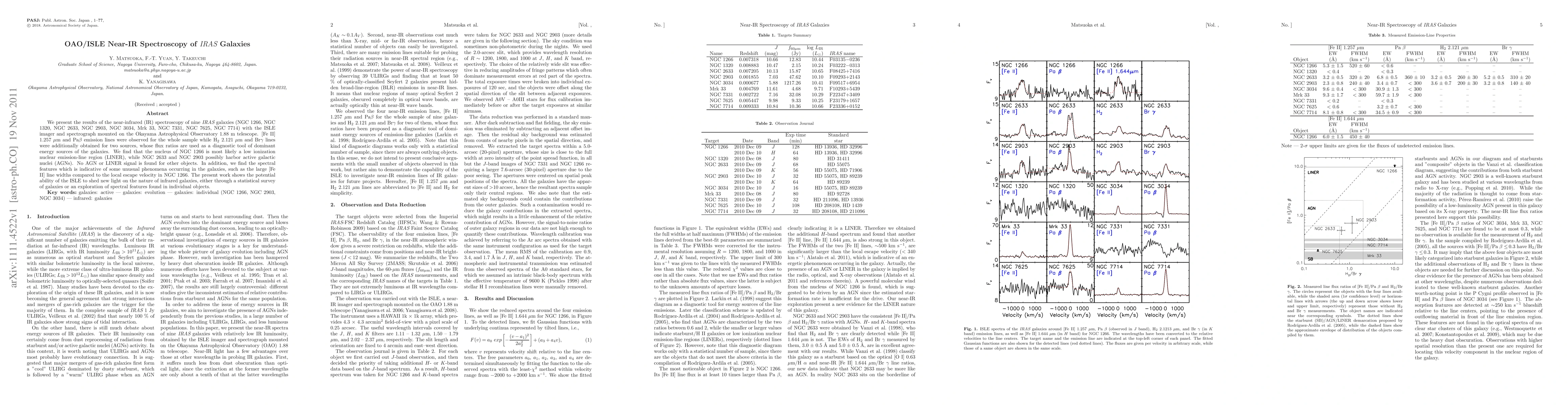 We present the results of the near-infrared (IR) spectroscopy of nine IRAS galaxies (NGC 1266, NGC 1320, NGC 2633, NGC 2903, NGC 3034, Mrk 33, NGC 7331, NGC 7625, NGC 7714) with the ISLE imager and spectrograph mounted on the Okayama Astrophysical Observatory 1.88 m telescope. [Fe II] 1.257 um and Pa beta emission lines were observed for the whole sample while H2 2.121 um and Br gamma lines were additionally obtained for two sources, whose flux ratios are used as a diagnostic tool of dominant energy sources of the galaxies. We find that the nucleus of NGC 1266 is most likely a low ionization nuclear emission-line region (LINER), while NGC 2633 and NGC 2903 possibly harbor active galactic nuclei (AGNs). No AGN or LINER signal is found for other objects. In addition, we find the spectral features which is indicative of some unusual phenomena occurring in the galaxies, such as the large [Fe II] line widths compared to the local escape velocity in NGC 1266. The present work shows the potential ability of the ISLE to shed new light on the nature of infrared galaxies, either through a statistical survey of galaxies or an exploration of spectral features found in individual objects.