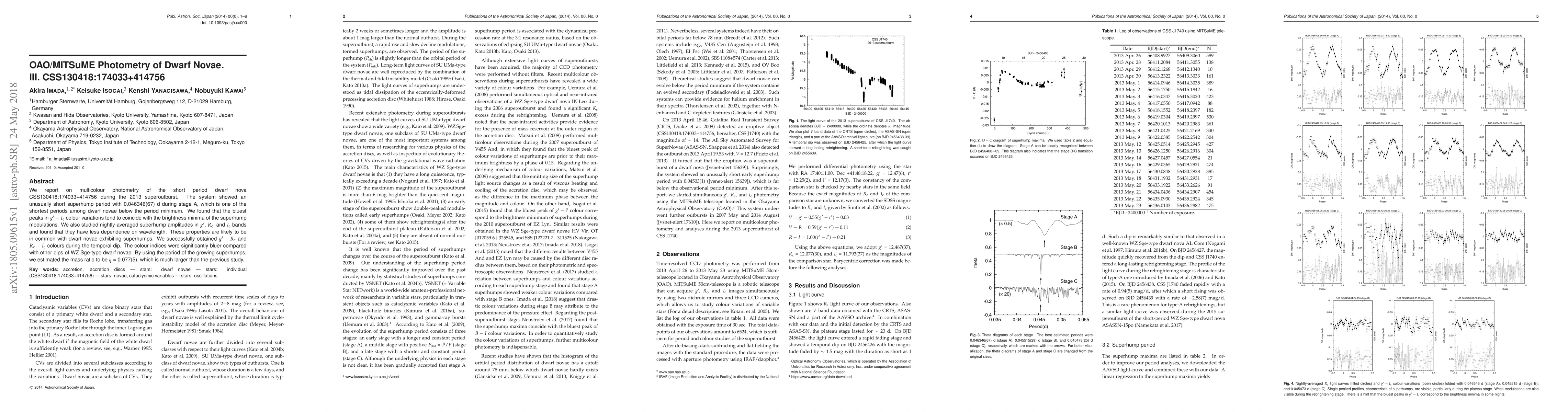 This paper reports on the multicolour photometry of the dwarf nova CSS130418:174033+414756 during its 2013 superoutburst, revealing an unusually short superhump period. The study found that the bluest peaks in colour variations coincide with superhump brightness minima, and the nightly-averaged superhump amplitudes show minimal wavelength dependence.